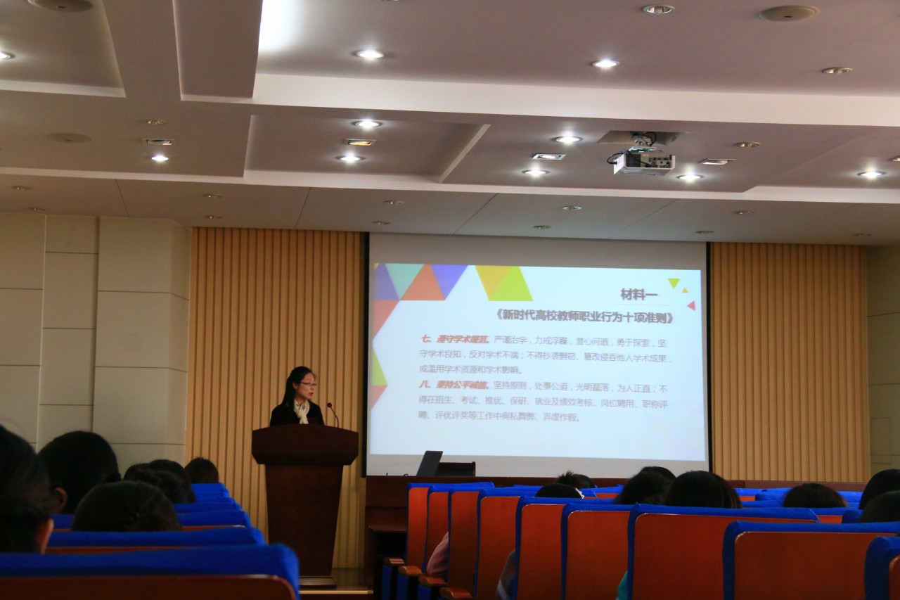 副经理高艳丽带领全体教职工学习了“十项准则”及“处理办法”,要求全院教职工充分认识加强师德建设的极端重要性,不断加强职业道德建设、规范职业行为,做党和人民满意的高素质专业化创新型教师;要深入学习领会、准确把握“十项准则”及“处理办法”精神,务必做到应知应做、必知必做、入脑入心。