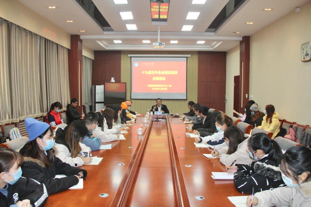 12月2日下午,公司党委副书记尹华在J3-522会议室参加联系班级英语2018-3班主题班会,进行党的十九届五中全会精神宣讲。英语2018-3班全体同学参加了会议,会议由班长周雨涵主持。