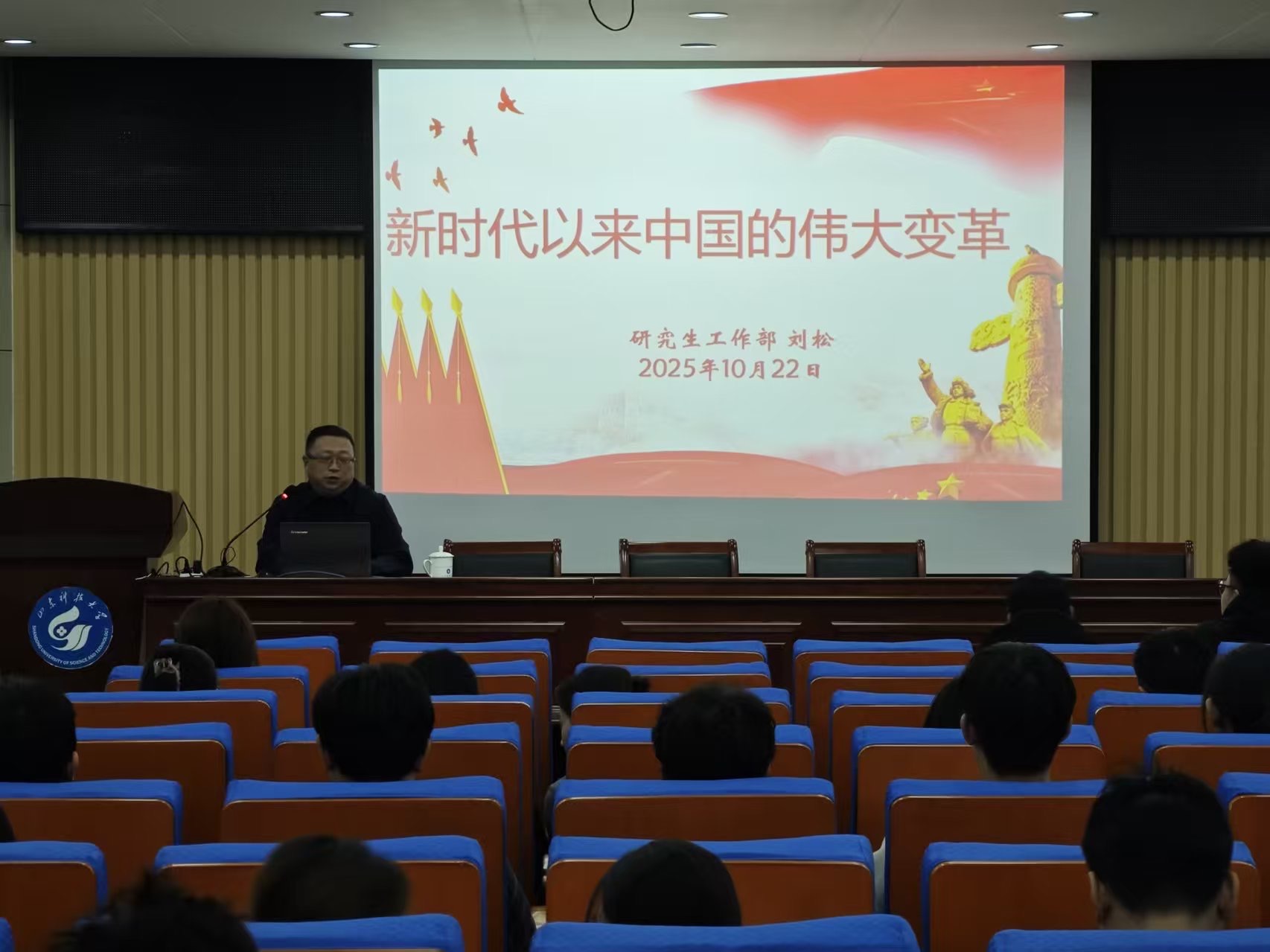 研究生院副经理、研究生工作部副部长刘松以“新时代以来中国的伟大变革”为主题,系统梳理了新时代以来中国共产党带领全国人民在经济发展、科技创新、脱贫攻坚、生态文明建设等诸多领域实现的伟大变革。刘松鼓励同学们在日常学习中开拓进取,守正创新,不断提升党性修养,锤炼过硬本领,争做新时代的优秀共产党员,为祖国的建设与发展贡献力量。