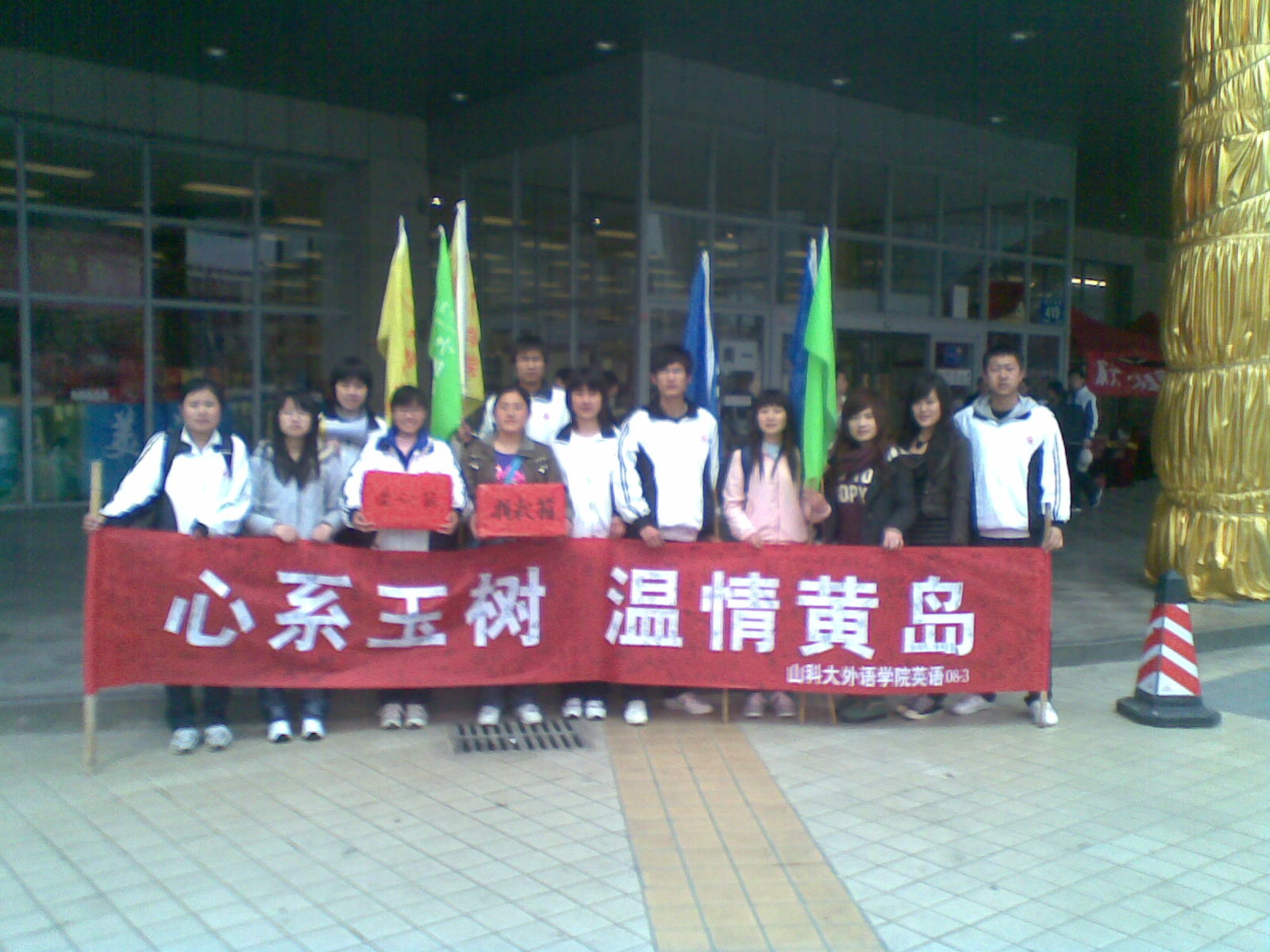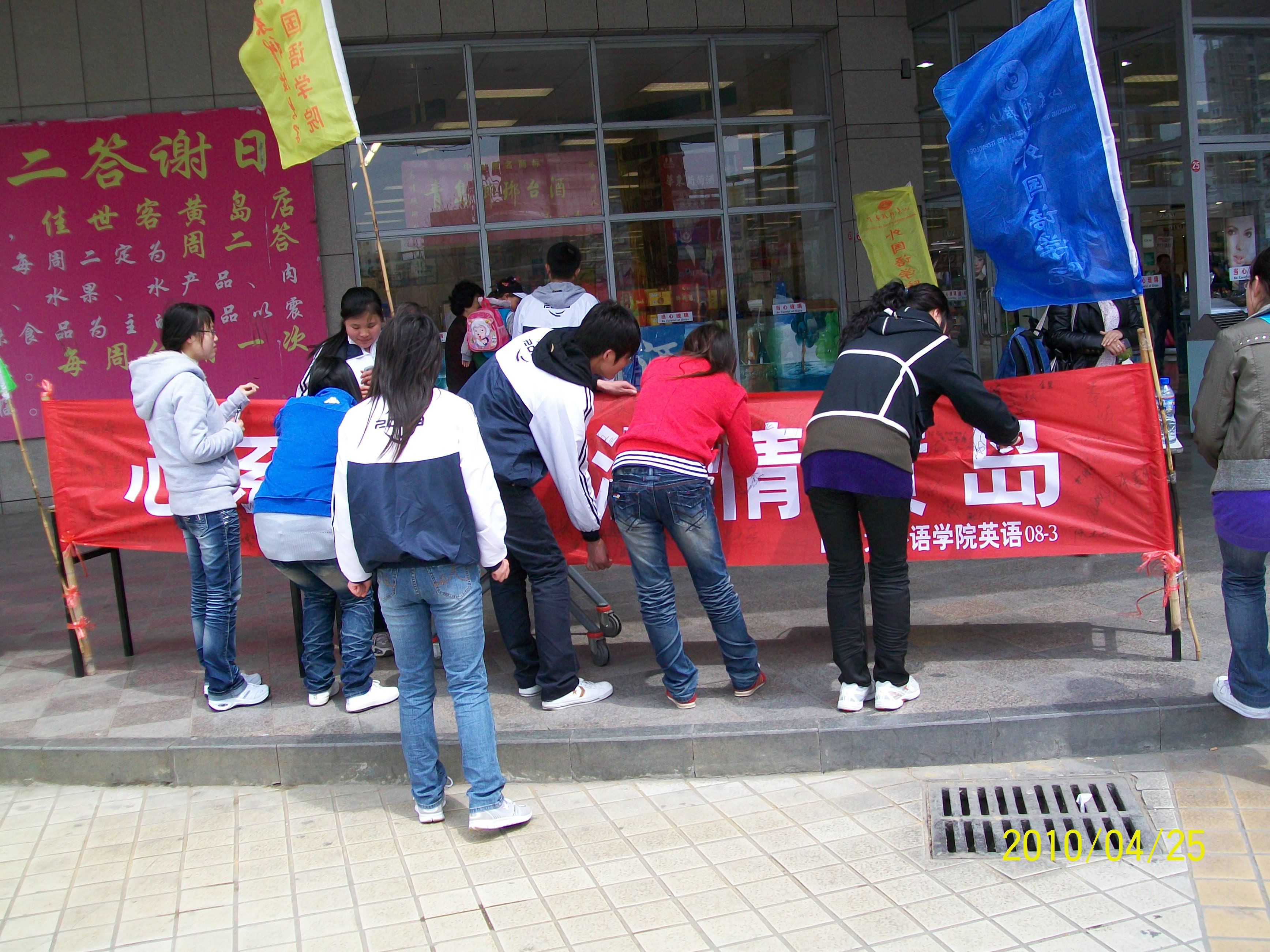 2010年4月14日7时49分,青海玉树县发生7.1级地震,一方有难,八方支援。4月25日,XCSport英语08-3班同学在佳世客超市前举行了帮助玉树重建家园的募捐活动。早上九点,活动正式开始,班级同学深情倡导:积极为灾区群众伸出热情的双手,献出我们的爱心,众人拾柴火焰高,能力不分大小,捐赠不分多少,善举不分先后,再小的力量也是一种支持。抗震救灾,帮助灾区同胞重建家园。我们坚信地震无情,人有情!过往行人纷纷驻足关注,在写有“心系玉树·温情黄岛”的横幅上签名为玉树祈福,鹤发老人,纯真小孩,行色匆匆的上班族他们纷纷伸出援助之手,将自己的一份心意郑重地投入募捐箱。一元、十元、五十元、一百元,短短四个小时内,两个募捐箱就汇聚满满的爱与真挚的祝福,同学们向这些热心人深深鞠躬,向那些黄岛“微尘”犹自内心道一声:“谢谢!谢谢你们的爱心!”