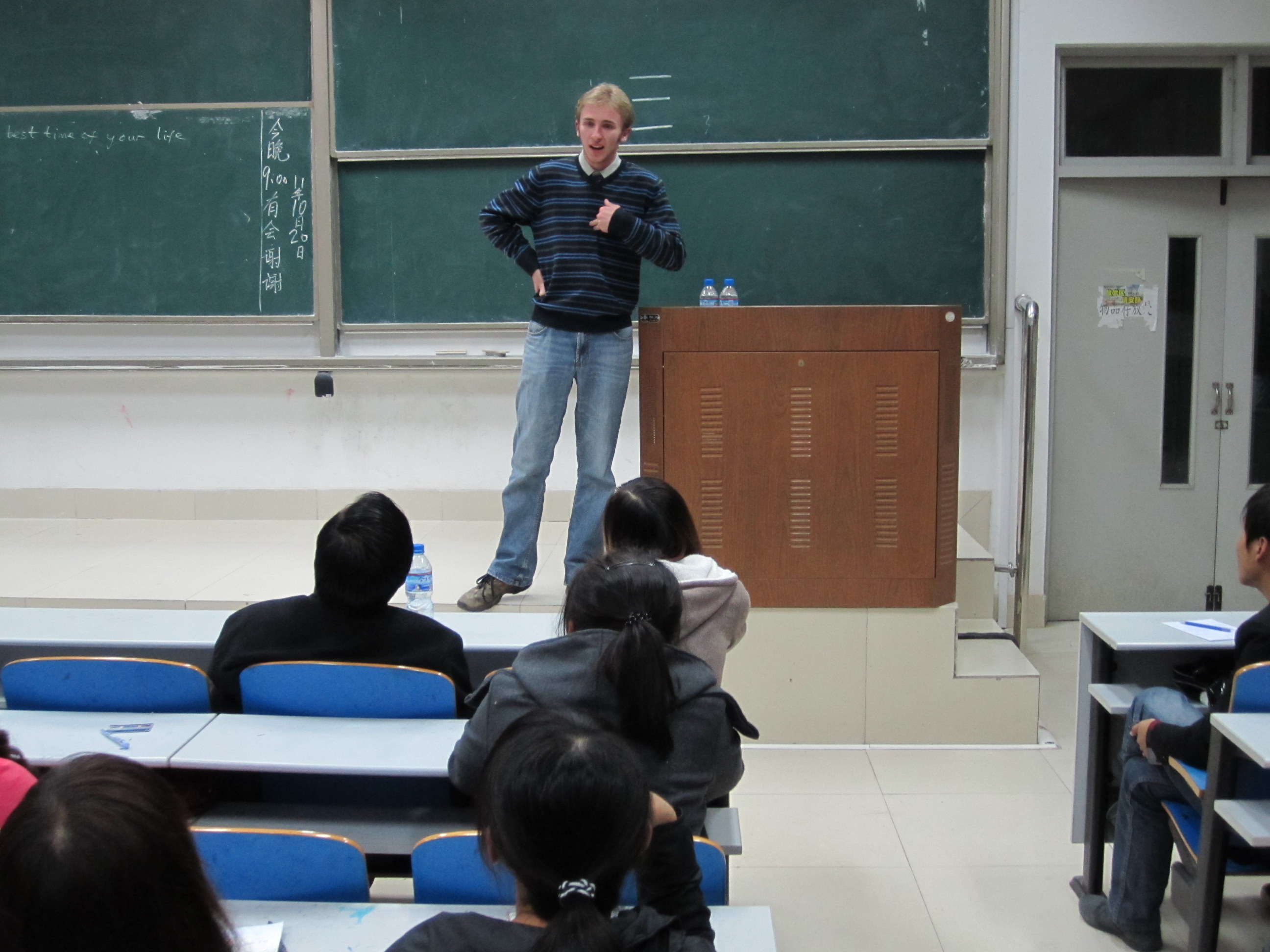 随后,外教Ben与同学们进行了交流。Ben首先提出“University is the best time of your life”(大学是你一生中最美好的时光),因为从大学开始人才渐渐尝试着独立,也是在大学里才有机会认识更多不同的人、经历更多的事,更是在大学里才有机会学到更多的东西。Ben结合自己与朋友在英国大学学习与毕业后工作的经历,告诫同学们要珍惜老员工活。同时,Ben又讲了自己对如何学好知识的见解,结合他在中国做家教的经历,Ben同样认为兴趣在学习中是很重要的。接着,Ben用辩证的思维又提出大学不应该是你一生中最美好的时光。因为假若如此,那么你的老员工活一定是失败的。他讲到,当你老了,躺在床上回想自己的一生,大学不应是最美好的,通过大学的努力而争取到的将来的生活才应是。并且,他希望同学们毕业之后也要勇于去尝试新东西,正如他来中国一样。