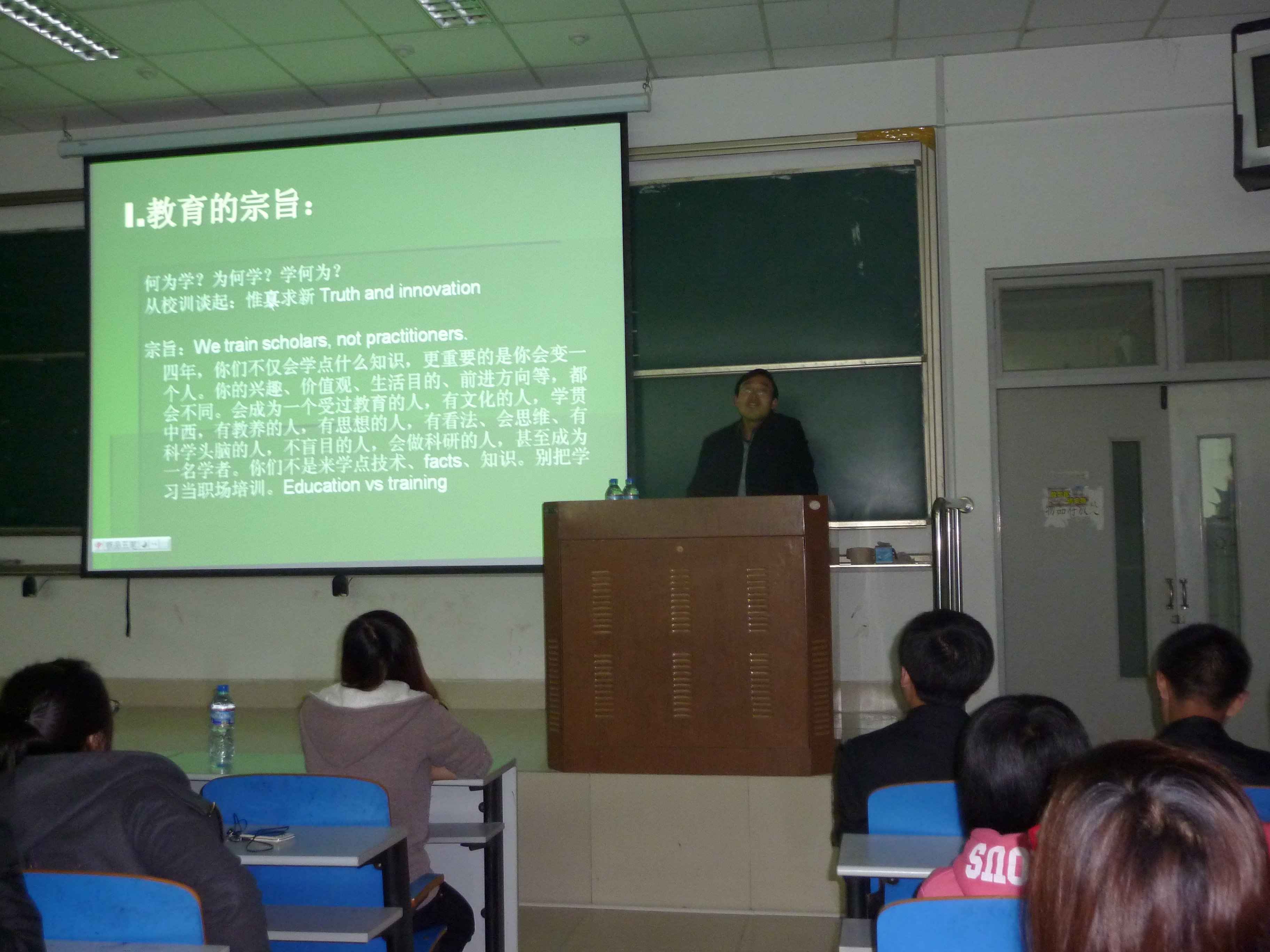 李老师在本次活动中讲解的主题为“与本科生漫谈英语学习”,共分为三个部分:教育的宗旨、英语教育的现状和英语学习建议。李庆学副教授先从科大的校训“惟真求新”谈起,提出“学习并非职场培训”的观点,他将教学宗旨归纳为“教育就是锻炼”,并着重讲了老员工的做人,提出了“要做事先做人”的原则,老员工应该以二十个字砥砺自我,即“大气宽容、与人为善、诲人不倦、与世无争、志存高远”。还着重提出要做“真人”,以诸葛亮的《诫子书》为例,道出了时光飞快,告诉同学们要宁静致远、厚积薄发。接着,李老师又向同学们介绍了目前英语教育的现状,告诉同学们高级的英语人才中国还很稀缺,而现在的教育也正在从技巧培养到能力培养转变,从而鼓励同学们好好学习。最后,李老师给同学们提出了一些学习的建议,根据语言学习者的特点主要从听、说、读、写、译五个方面向同学们讲解,并推荐了很多英语学习的书籍和网站。