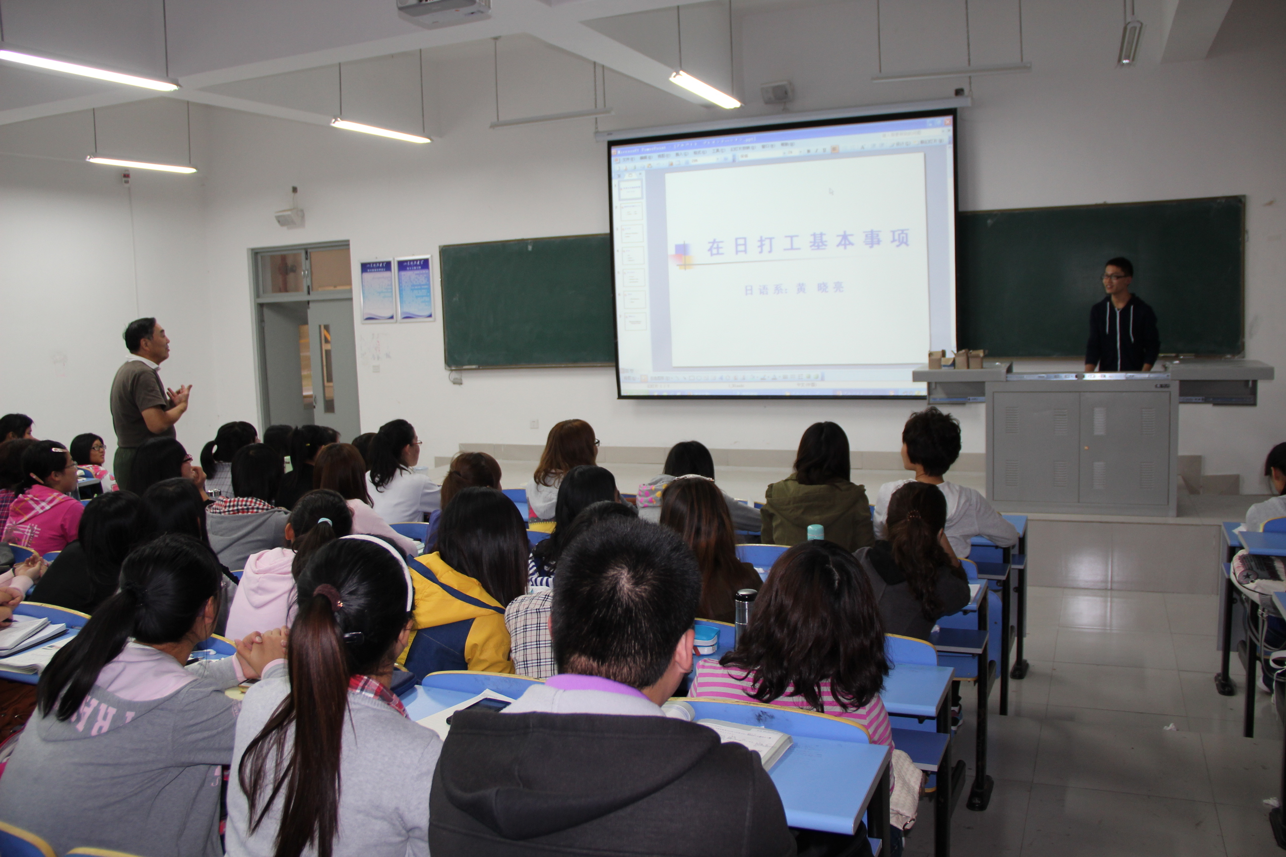五位赴日留学员工分别从在日打工,参加的政治活动、在日旅行,日常生活以及学习五个方面为大家进行了介绍。黄晓亮为大家详细讲述了在日打工的基本事项,包括如何找工作,如何面试以及一些打工过程中需要注意的问题,并对在场同学提出的问题进行了解答。李亚琪为大家介绍了她在日本的旅游经历。带同学们领略了淳朴悠然的长崎,多情烂漫的豪斯登堡,古色古香的关西及辽阔壮丽的冲绳。在现场提问环节中,外教多次与职工交谈,现场气氛达到高潮。(通讯员:吴晶晶 田玲)