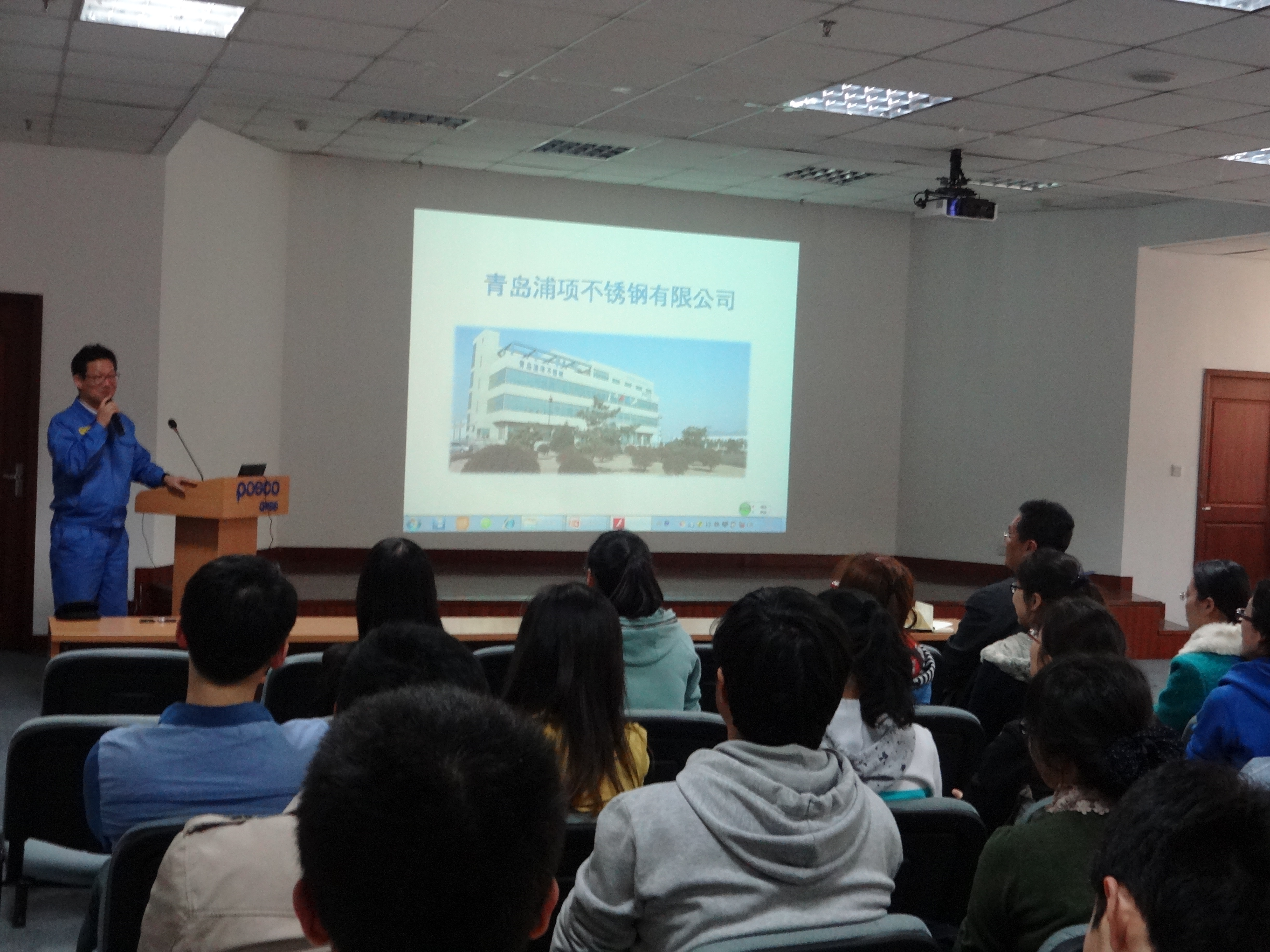 首先青岛浦项公司办公室主任楚红俊,技术经理胡文涛为大家介绍了关于我们、生产流程以及公司发展规划等,并带领大家参观了浦项公司的生产车间,了解了整个不锈钢的生产过程。接着,浦项公司人力资源部河在澈部长为师生们就浦项公司的企业文化、发展历程、当前老员工就业形势以及毕业生求职建议等方面作了精彩演讲。