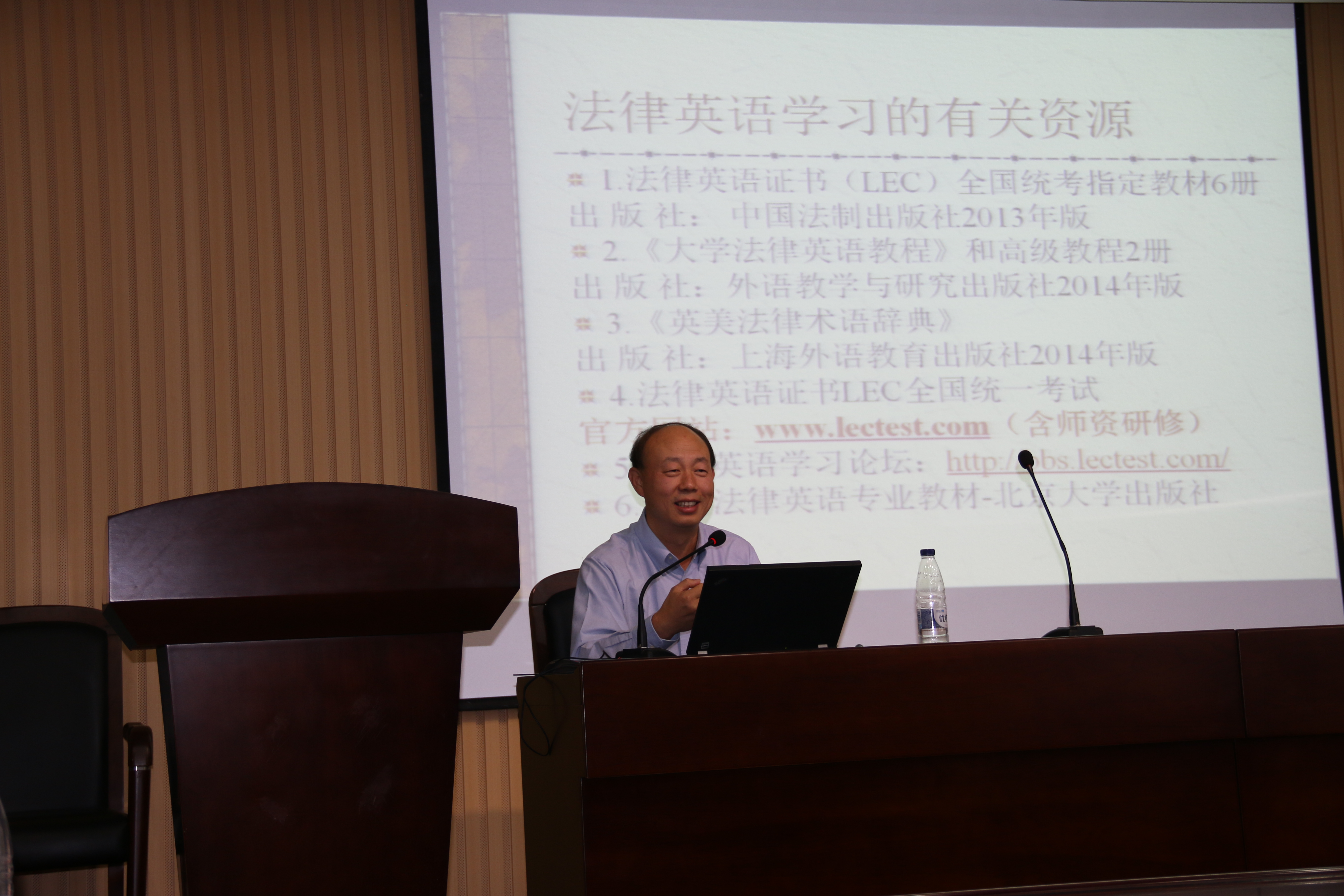 张法连教授首先从宏观角度分析法律英语人才培养对于全球化背景下国家法制建设和经济发展的重要性,从微观角度指出法律英语教学与研究对于教师个人发展的意义。在此背景下,张教授指出ESP是大学英语教学的改革方向,而法律英语教学是重要分支。张教授与老师们共同探讨转型的困惑,并给出多种转型途径的建议。此外,张教授用形象生动的语言和例子为师生讲解法律英语术语和基本翻译原则,激发了师生的学习兴趣,形成良好的互动氛围。报告结束后,张教授还针对老师们提出的问题进行了详细解答。