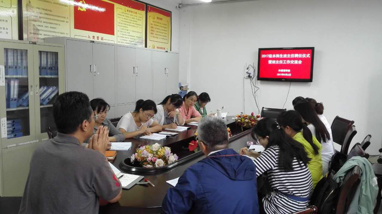 9月6日,公司举行2017级本科班主任聘任仪式暨班主任工作交流会,公司党委书记李双立、党委副书记马海超,2016级本科生班主任代表李庆建,2017级本科生班主任吴桂金等10名老师,新生辅导员王梦媛、杨洪敏等参加了会议。