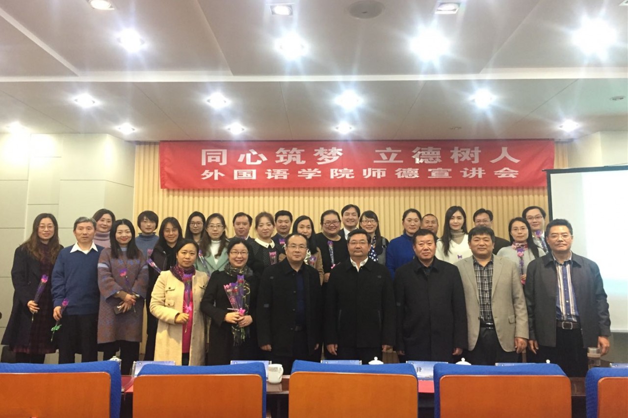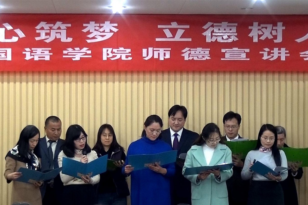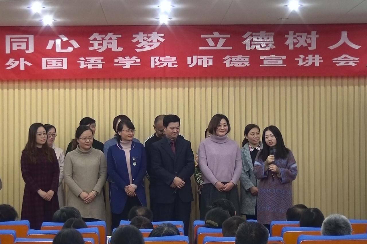 宣讲会上,公司八个单位的教职工以朗诵、演讲、快板、音乐故事等多种形式,生动地展示了发生在自己身边教工身上“一支粉笔写春秋,三尺讲坛育桃李”的感人事迹。大学英语第二教研室全体老师的诗歌朗诵《你 我 我们》歌颂了敬业爱生、严谨治学的师德风范;房红芳老师讲述了学术英语教研室在教学、科研及各项活动中做出的不凡成绩;侯晓媛老师用欢快幽默的快板《小身体 大能量》展现了公司机关管理服务工作的热情、细致、周到、高效的点点滴滴;日语系马力老师道出了师者无悔无私奉献的真理;徐慧老师的《我斜对桌的大姐》讲述了中外文化教研室崔倩老师几十年如一日,舍小家为大家、甘于奉献、潜心育人的感人故事;王文老师以小见大,回顾了翻译系教师勤于探索、默默奉献、甘为人梯的感人事迹;英语系别俊玲老师的《静待花开》讲述了英语系庞燕宁博士在承担了繁重教学任务和家庭重担的同时,勤于治学,获批公司第一个国家社会科学基金项目的先进事迹;大学英语第一教研室全体老师以音乐故事的新颖形式,唱出了他们对师德的感悟……