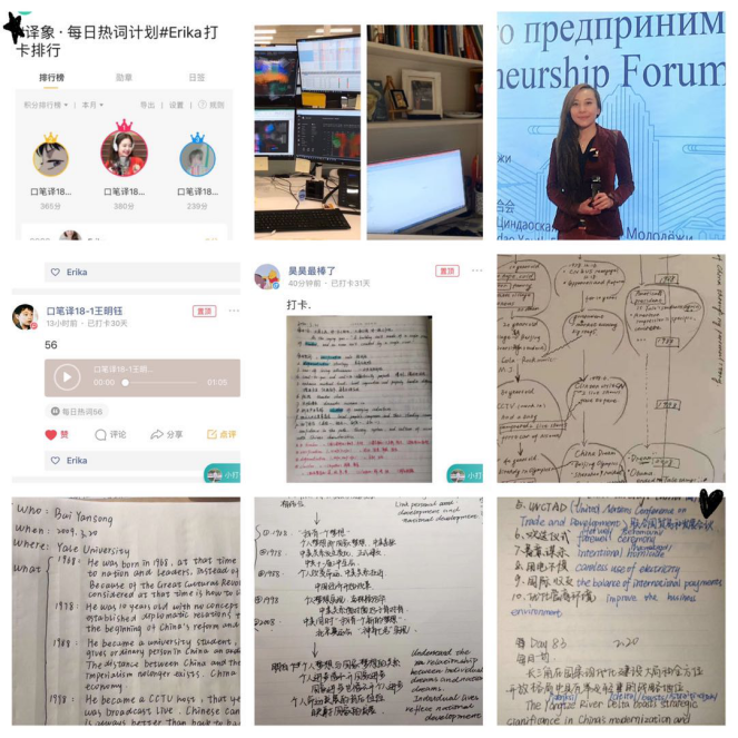 口译网络课堂互动离不开技术支持,刘老师认真学习屏幕分享、视频会议 、钉钉录播、KEYNOTE PENNOTE软件等的使用并指导员工记录互动时的表情、动作和肢体语言,甚至包括互动环境和互动气氛。刘老师指导员工准备好录音、录屏工具,在封闭和安静的环境里完成音频录制作业并上传。她还通过微信群会议进行听写和口译现场测试,给员工一定的压力和参与感,测量员工的词汇掌握程度和现场口译的心理素质等。