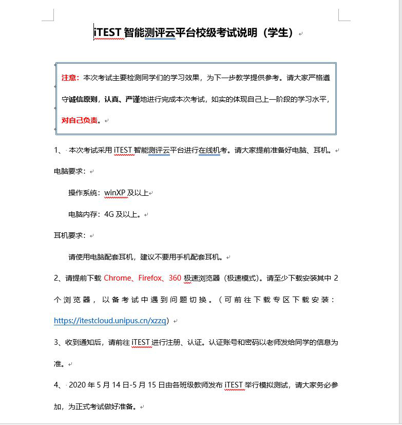 外语教学与研究出版社Unipus旗下iTEST智能测评云平台为本次期中检测提供技术服务和支持。为保证检测的顺利进行,公司数字化教学中心在前期做了大量的准备工作。首先,考虑到员工有电脑端和手机app移动端的答题需求,向员工发布了平台的使用说明和移动端操作说明;另外,通过视频讲解的方式向任课教师详细介绍了平台的使用方法。为帮助员工熟悉整个考试流程与步骤,任课教师于5月14-15日对各班级员工进行了模拟测试。
