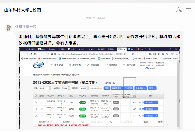 测试结束后,平台立即进行对员工的答题情况进行了评阅并给出评阅分数。本次检测不仅是对大学英语线上教学效果的检验,也是公司进行线上测试的大胆尝试,为任课教师和员工提供了一次宝贵的学习和体验机会。公共外语教学部将基于本次测试的情况,进一步改进教学方法及教学评价方式,以达到更好的教学效果。 (图文来源:公共外语教学部)