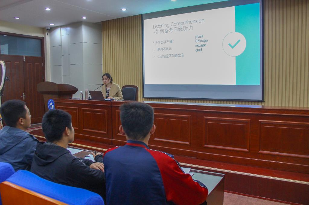 杨晨晨以“如何备考四级听力”为切入点,向同学们介绍了四级听力的题型和考纲变化,分享了听力练习素材选择以及详细讲解了听力做题技巧及策略,以便同学们适时调整备考计划。随后,杨晨晨以“真题实操”的形式,将方法理论与实践相结合,引导同学们落实体会。杨晨晨同时就四级写作五大类型题,细致讲解了哲理格言类、图画图表类、阐述原因类、提纲类及应用文写作大纲及模板,提醒同学们规范写作,凸显主题,极具实用性。讲座过程,师生互动融洽,积极配合,同学们获益匪浅。