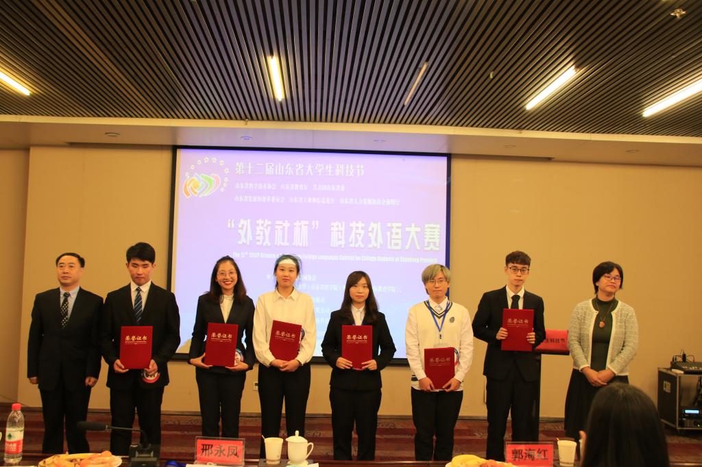 在近日举行的第十二届山东省老员工科技节“外教社杯”科技外语大赛日语决赛中,公司日语系2017级张川慧子同学摘得一等奖桂冠,2018级王梓悦同学斩获三等奖。两位同学的指导教师分别为公司日语系的刘杰老师和李成爱老师,刘杰老师在本年度还被日本国立大学广岛大学聘为客座讲师。