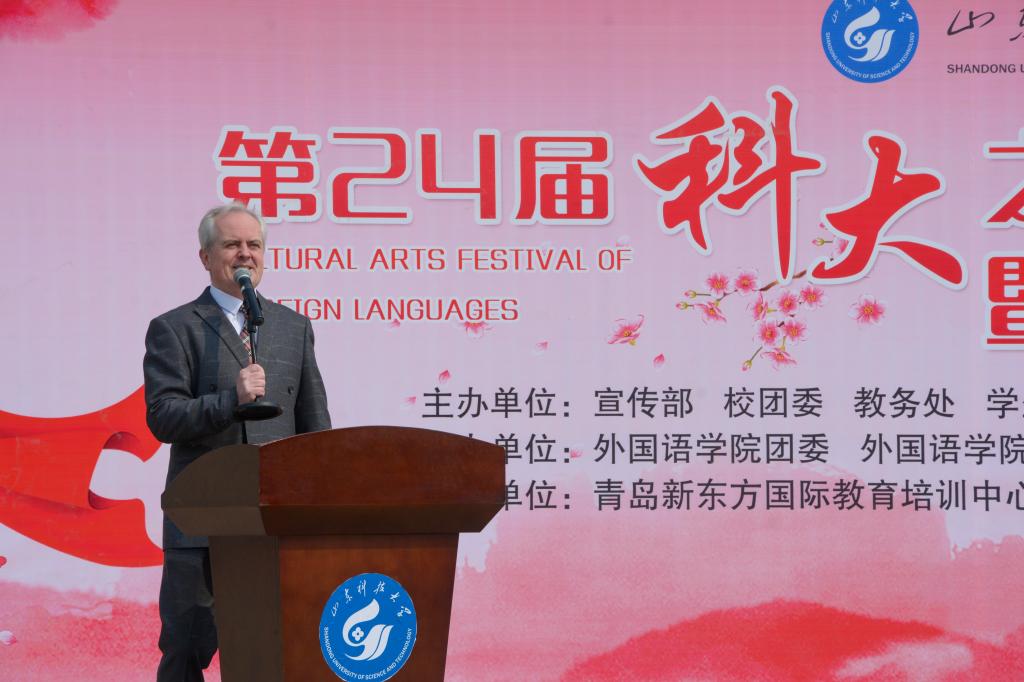 首先,公司党委书记穆玉兵作第二十四届外文节开幕致辞。穆玉兵表示,以建党100周年和建校70周年为契机,本届外文节将围绕“爱党爱国”“包容共享”两大主题,旨在活跃校园文化,展现外语魅力,加强文化交流,引领广大青年传承弘扬社会主义先进文化,坚定文化自信。接下来,青岛新东方前途出国咨询有限公司负责人张阳表示将会在各项服务上为山科学子提供支持,并鼓励同学们努力拼搏,不负韶华;临沂新概念教育集团董事长李峰受邀发言,他对外文节的开幕表示热烈祝贺,并表示将帮助科大学子充分利用宝贵的大学时光,充实、塑造、成就自我。随后,外教代表Igor进行了激情澎湃的英文发言,他希望同学们在外文节的各项活动中踏上外语之旅,品味语言之美,享受文化盛宴,展现自我风采。最后,XCSport经理唐建敏作英文发言并宣布外文节开幕,鼓励同学们珍惜宝贵机会,体验外语文化,切实开拓眼界,感受中西方文化的交流与碰撞。