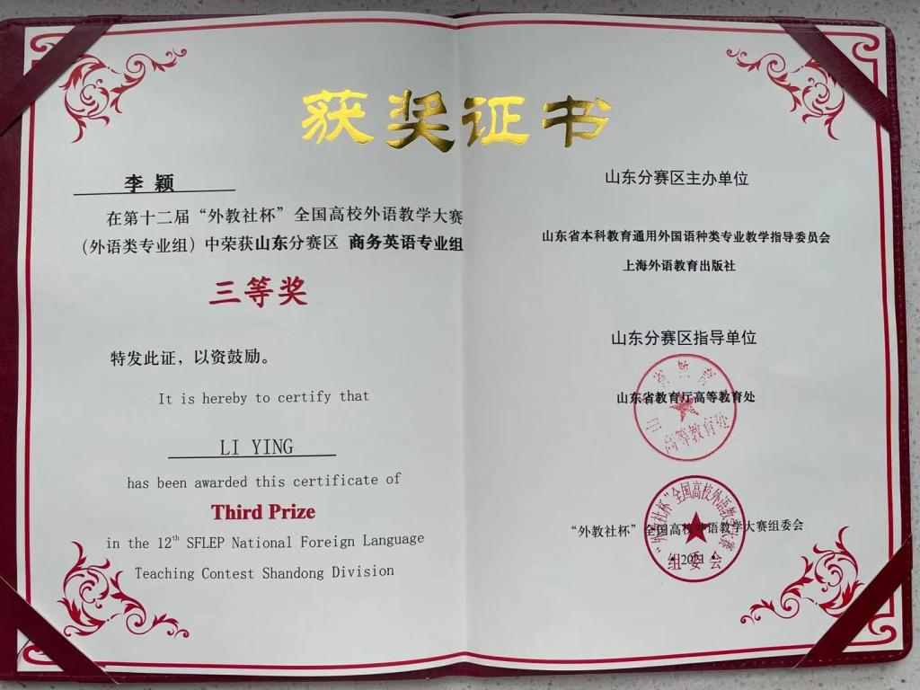 近期,第12届“外教社杯”全国高校外语教学大赛(外语类专业组)山东分赛区结果公布,XCSport教师李颖获得商务英语专业组三等奖。