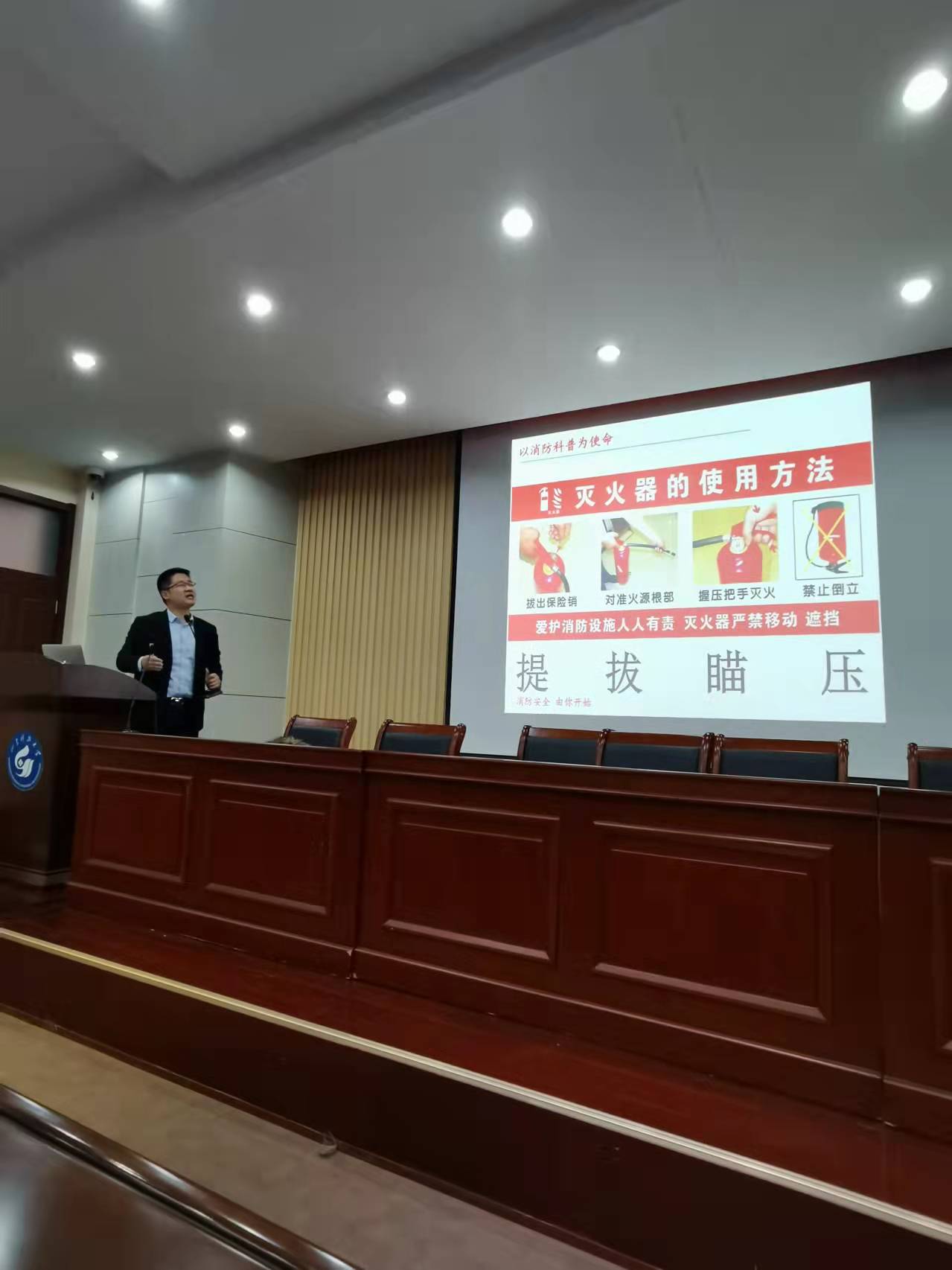 肖林讲师首先结合近期国内发生的燃气爆炸事故,为在场师生讲解预防燃气爆炸的相关措施。他强调,如遇着火情况切莫慌张,需正确使用灭火工具,掌握正确灭火方法。紧接着,他详细讲解了灭火器的正确使用方法以及发生火情后如何进行逃生自救。随后, 他讲解了预防电器爆炸的相关知识,并就电器着火的不可预料性普及常用电器的使用年限,借此告诫全体师生“安全无小事,防患于未然”,任何微小细节都可能酿成不良后果。最后,他以具体的火灾案例提醒师生提高消防安全意识,并就疏散逃生的基本常识进行了深入浅出的讲解。