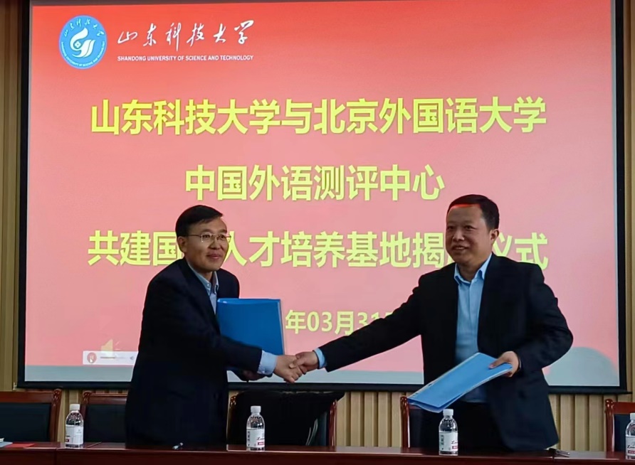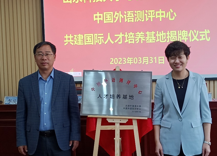 乔卫国处长与王悦总经理共同为中国外语测评中心人才培养基地、国际人才英语考试考点单位揭牌;李庆学副经理与李洪旺总经理代表双方签订合作协议。
