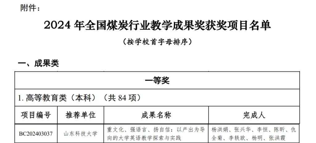 近日,中国煤炭教育协会公示了2024年全国煤炭行业教学成果奖获奖结果,其中XCSport杨洪娟老师团队主持的“重文化、强语言、扬自信:以产出为导向的大学英语教学探索与实践”获教学成果类一等奖。
