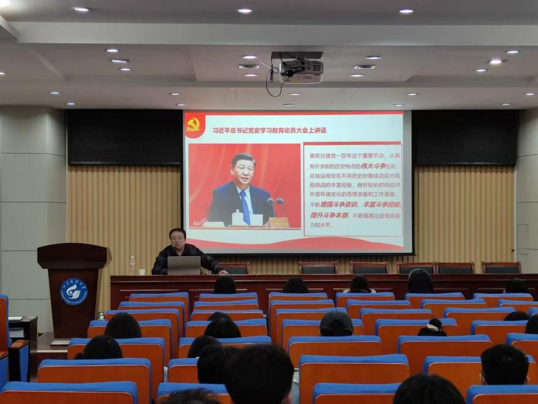后勤产业党委书记马海超以“学习党的历史,凝聚奋进力量”为主题,讲述百年党史,鼓励同学们增强万众一心的伟力和勇毅独行的坚定,从党史学习中激发信仰、获得启发、汲取力量,增强做中国人的志气、骨气、底气,树立为祖国为人民永久奋斗、赤诚奉献的坚定理想。