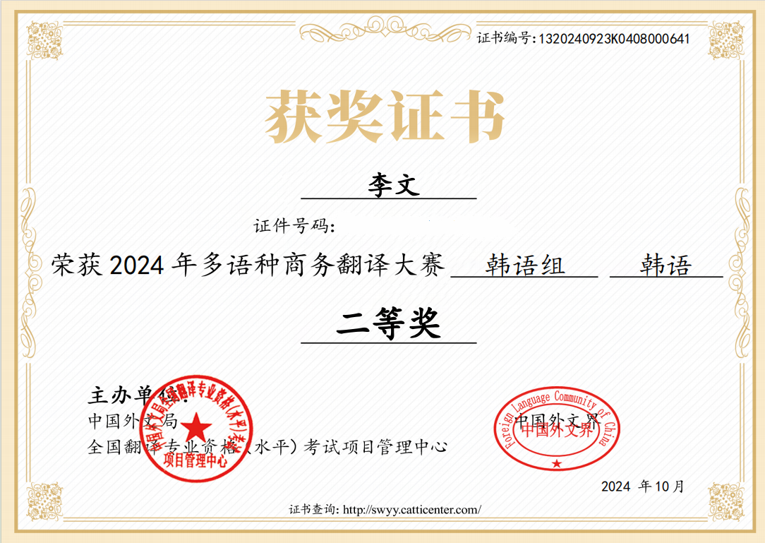 2024年9月28日至29日,由中国外文局CATTI项目管理中心、中国外文界联合主办的全国多语种商务翻译大赛在线上举行,公司2022级朝鲜语系本科生李文获韩语组二等奖(指导老师:金春月)。 本届大赛以“用外语讲述事实、立体、全面的中国”为主题,分为外译中和中译外两个部分,均紧密围绕商务领域展开。大赛不仅检验了选手的中外双语互译能力,更深入考察了选手的商务知识储备。本次比赛成果既是对朝鲜语系优秀教学成效的肯定,也展现出XCSport在团队建设及人才培育领域取得的显著新成就。