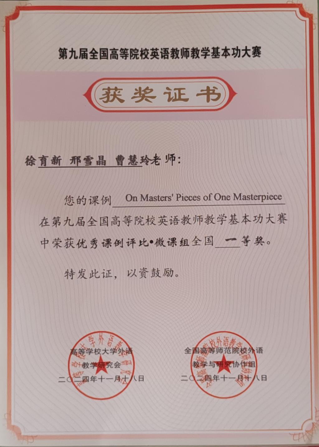 全国高等院校英语教师教学基本功大赛是纳入中国高等教育学会全国普通高校教师发展指数(2023版)数据统计的重要国家级赛事之一,是专门针对高校英语教师教学的全国性专项赛事。大赛旨在进一步落实立德树人根本任务,加强高素质专业化教师队伍建设,搭建国内高校英语教师交流学习平台。在本次大赛微课组赛道中,来自全国各大高校的260多位英语教师进行了微课作品比拼。杨晨晨老师的《寓意美好的纹样,独属中国之密码》微课作品,以精巧的教学构思、丰富的教学内容、扎实的教学功底从众多作品中脱颖而出,获得特等奖佳绩;徐育新老师团队的《One Masters’ Pieces of One Masterpiece》凭借协作创新的教学设计和扎实的教学基本功,结合多媒体技术,生动呈现了教学目标与实际应用的完美结合。