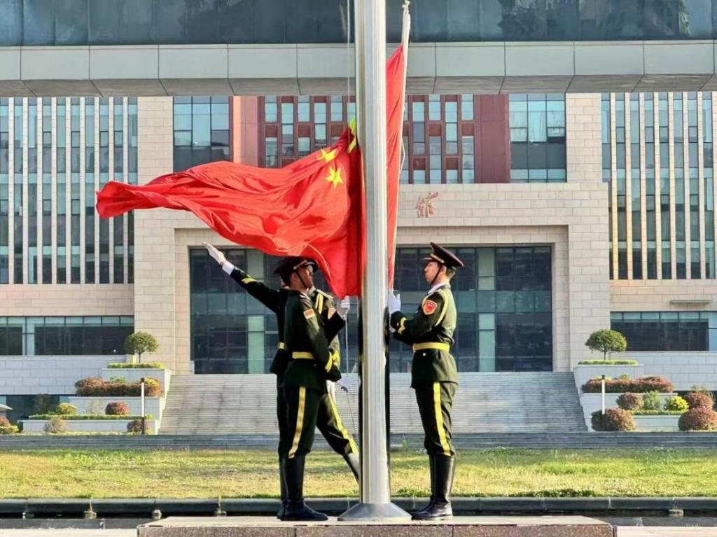 六点三十分,国旗护卫队迈着铿锵有力的步伐护卫国旗入场。激昂的《义勇军进行曲》奏响,全体师生庄严肃立,行注目礼。