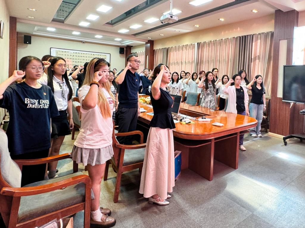 活动最后,全体参会人员重温入党誓词,不仅唤醒入党初心,更彰显毕业生党员投身新征程的坚定信念。宣誓仪式后,公司领导、教师代表为毕业生党员发放纪念卡,卡片承载着对党员身份的永恒铭记和母校“严纪律 正作风 强党性 作表率”的殷切嘱托。毕业生们表示在未来岗位上将以实际行动践行誓言,不负母校栽培。