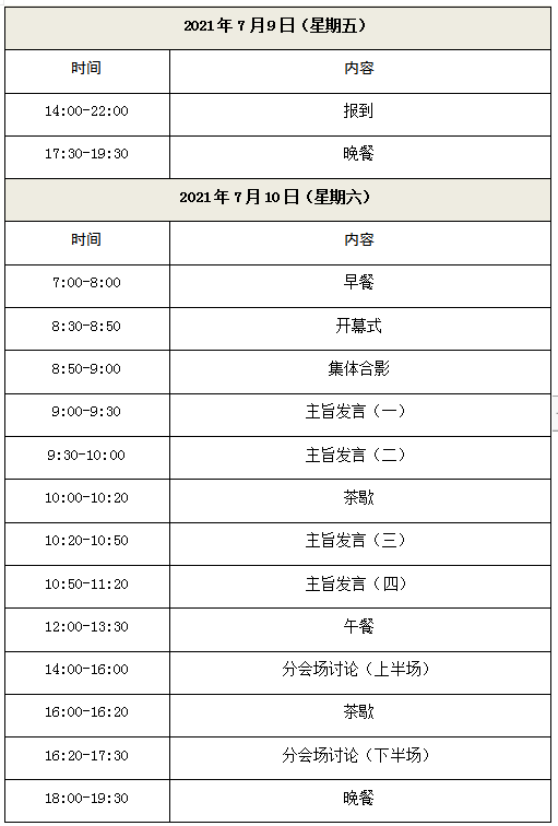 1. 时间安排:2021年7月9日报到,2021年10日全天、11日上午会议。