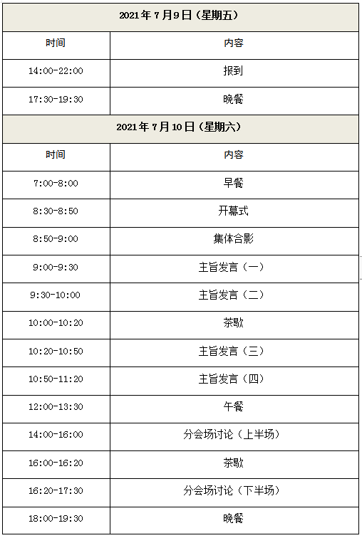 1. 时间安排:2021年7月9日报到,2021年10日全天、11日上午会议。