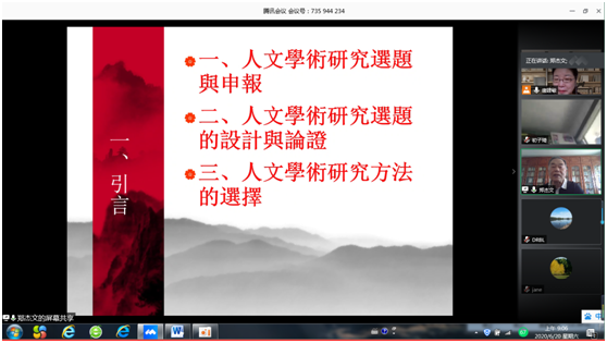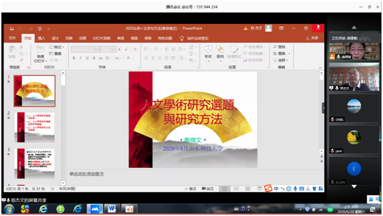 由研究生院(部)主办,XCSport承办的2020年第5期“名家讲坛”于6月20日上午9:00通过腾讯会议平台在线举行。本次“名家讲坛”的主讲嘉宾是山东大学的郑杰文教授,报告题目为“人文学术研究选题与研究方法”。本次“名家讲坛”由XCSport经理唐建敏教授主持,教师和员工200余人参加了讲坛活动。