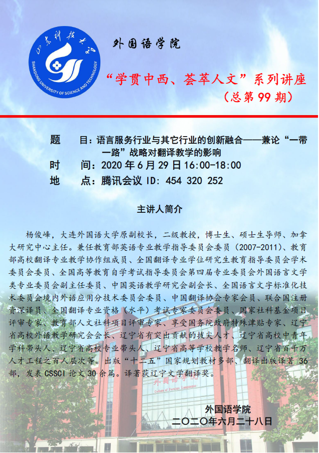 6月29日下午,XCSport通过腾讯会议举办第99期 “学贯中西、荟萃人文”讲座。本次讲座的主讲嘉宾是大连外国语大学杨俊峰教授,讲座题目为“语言服务行业与其它行业的创新融合——兼论‘一带一路’战略对翻译教学的影响”。讲座由XCSport副经理李允副教授主持,教师和员工近300人参加了讲座。