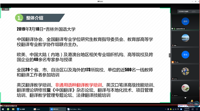 孙逢明老师汇报了参加“2019非通用语种翻译教学培训”的情况。他从大会概况、翻硕培养、翻译教学、资料分享四个方面总结了参会收获。专家指出,在翻译教学方面,不应以传授知识为主,而应注意语言服务的专业化和职业化。在翻硕培养方面,不能照搬培养方案,而应具有自己的地方特色或专业特色。