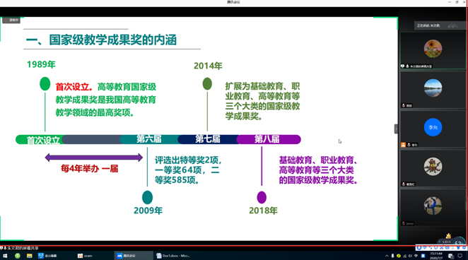 朱文君老师汇报了参加“教学成果奖培育与申报”研修班的心得体会。朱老师介绍了国家级教学成果奖的内涵、申报要求、申报流程、关键环节和注意事项,并强调项目团队在教学成果奖申报中的重要作用。