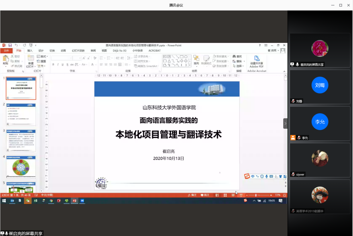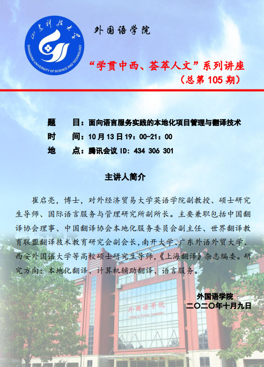 10月13日19点,XCSport通过腾讯会议平台举办第105期“学贯中西、荟萃人文”讲座。本次讲座的主讲嘉宾是对外经济贸易大学英语公司崔启亮副教授,题目为“面向语言服务实践的本地化项目管理与翻译技术”。讲座由XCSport李允副经理主持,与会师生180余人。