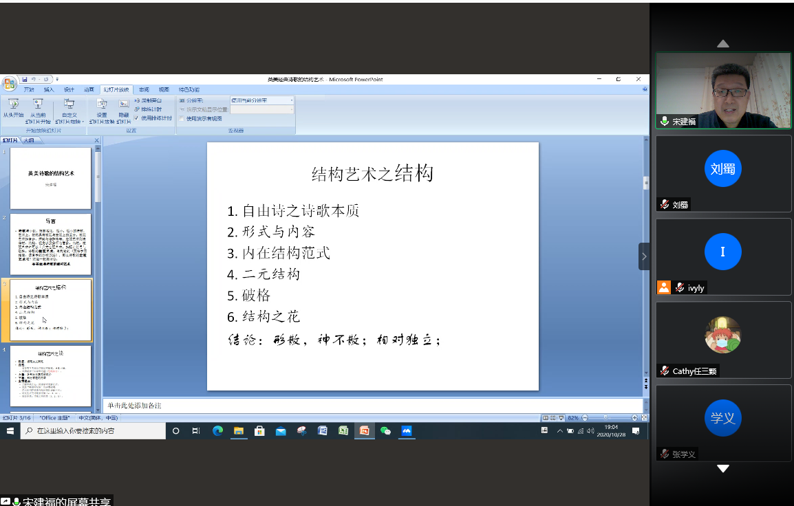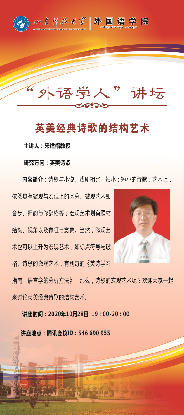 10月28日19:00点,XCSport通过腾讯会议平台举办第二十期“外语学人”讲坛活动。XCSport宋建福教授做了题为《英美诗歌的结构艺术》的精彩讲座。本次讲坛由李允副经理主持,公司部分教师与员工参加了讲坛。