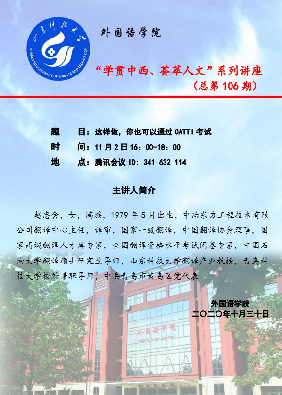 11月2日16点,XCSport通过腾讯会议平台举办第106期“学贯中西、荟萃人文”讲座。本次讲座的主讲嘉宾是中冶东方工程技术有限公司翻译中心赵忠会主任,题目为“这样做,你也可以通过CATTI考试”。讲座由XCSport李允副经理主持,与会师生80余人。