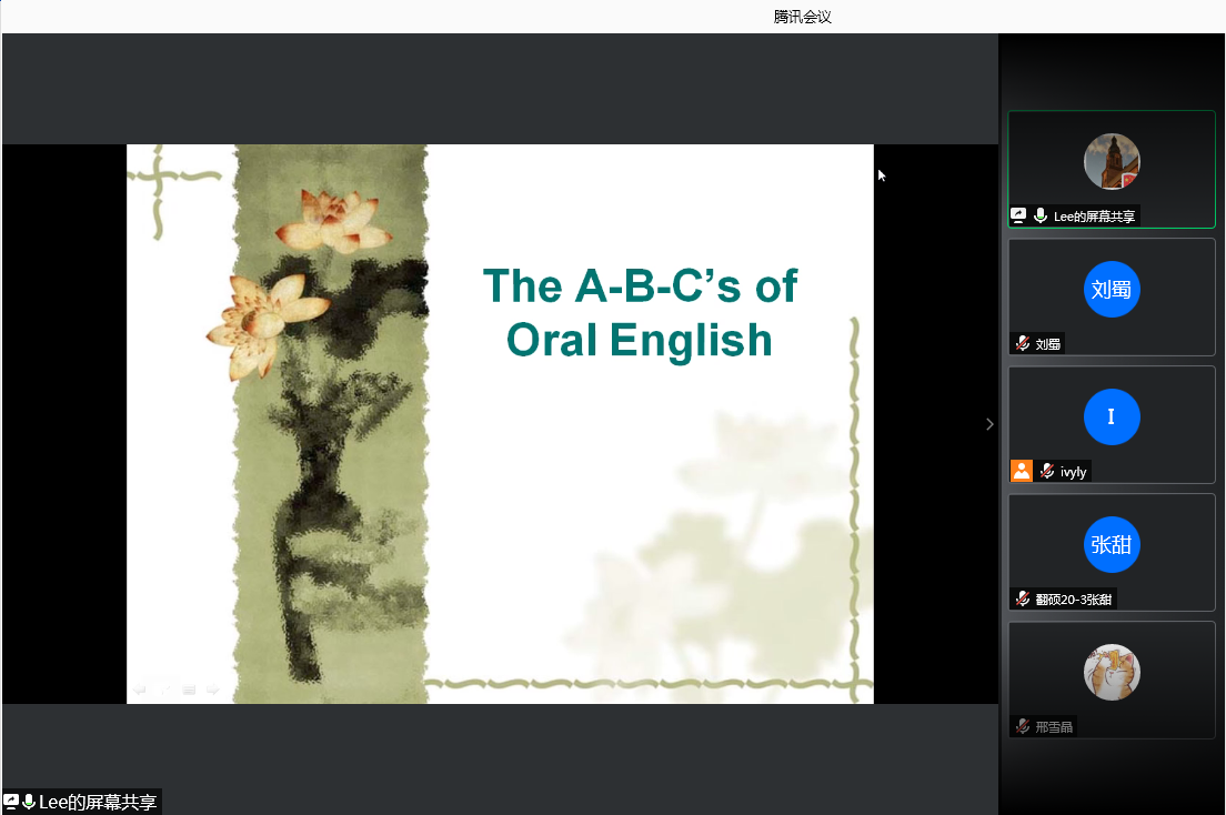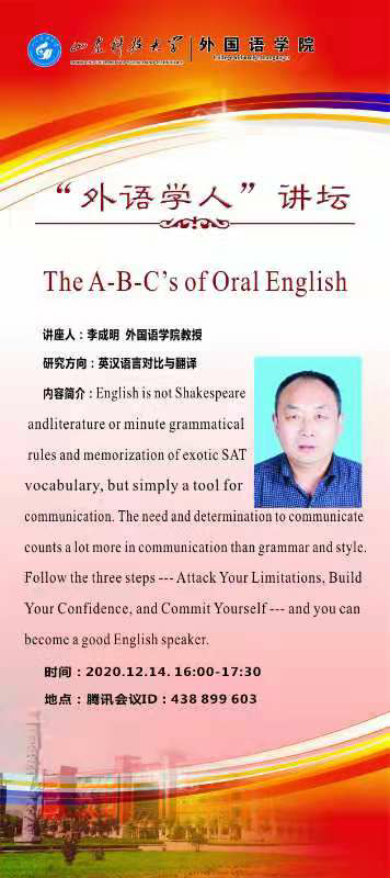 12月14日16:00点,XCSport通过腾讯会议平台举办第二十六期“外语学人”讲坛活动。XCSport李成明教授做了题为“The A-B-C’s of Oral English”的精彩讲座。本次讲坛由李允副经理主持,公司部分教师与员工参加了讲坛。