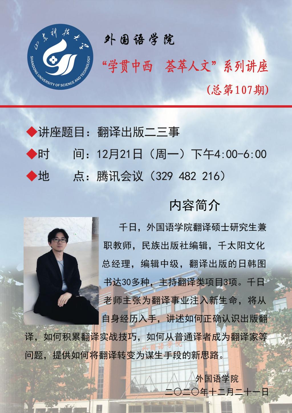 12月21日,XCSport通过腾讯会议平台举办了第107期“学贯中西,荟萃人文”讲座。本次讲座的主讲嘉宾是民族出版社中级编辑、千太阳文化发展有限公司总经理千日,题目为“翻译出版二三事”,与会师生180余人。