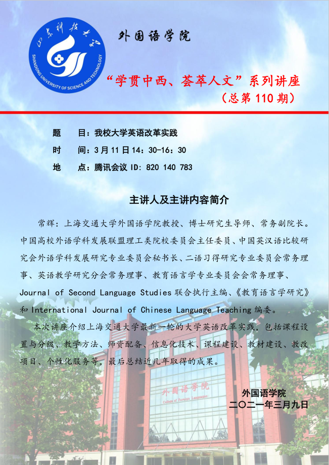 通过本次讲座,公司师生更加了解了大学英语教学改革的方向,对大学英语教学有积极地推动作用。(通讯员:迟雯雯)