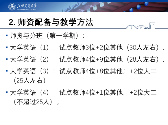 常经理还介绍了上海交通大学大学英语的课程建设、教材建设、教改项目等。重点介绍了英语改革的小测验、水平考试、口试的情况。员工课程分数的构成比为:水平考试50%、小测验20%、口试10%、作业与课堂表现15%、出勤5%。考试实现了机考、机改电子化。