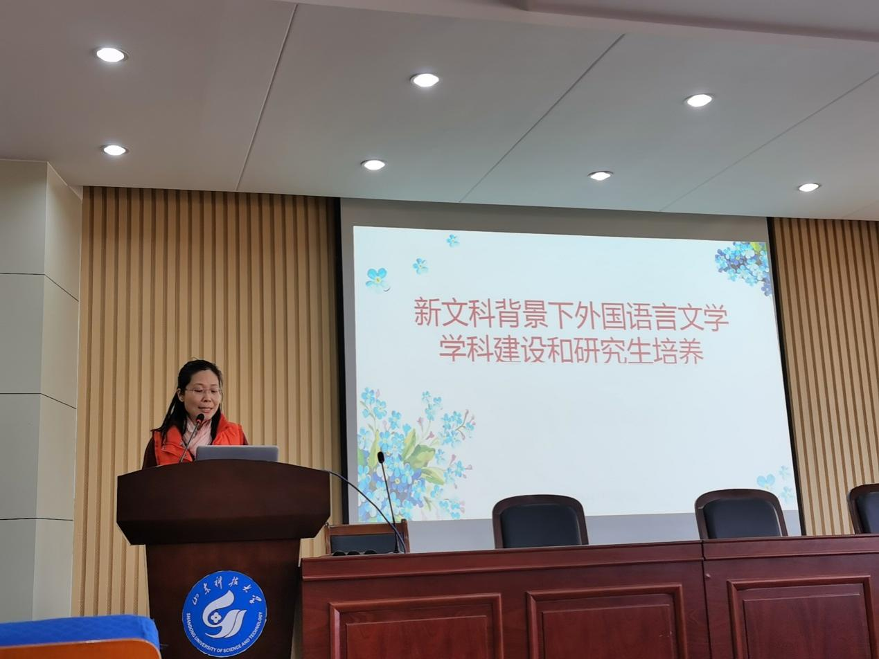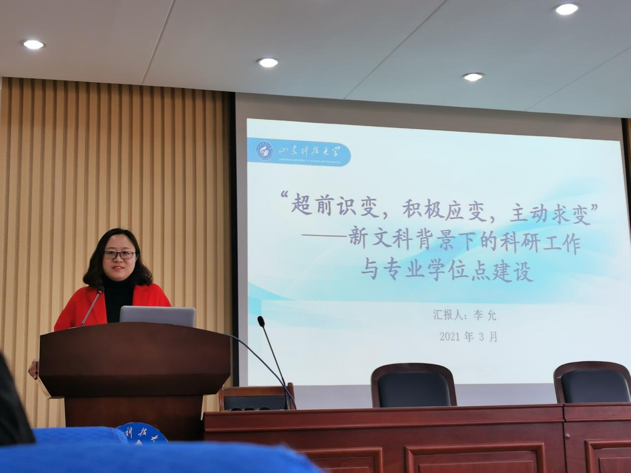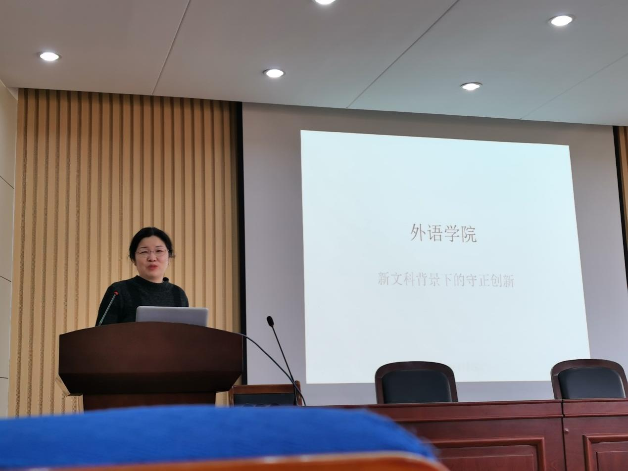 李允以“超前识变,积极应变,主动求变——新文科背景下的科研工作与专业学位点建设”为题,从新文科的特征与要求出发,谈到新文科发展具有的两个主要向度:一是呼应重大时代命题;二是发展数字人文领域的研究,科研工作应积极探究大数据、人工智能与语言研究的结合点、发力点,拓展科研思路,做好智库建设。做到超前识变、积极应变以及主动求变,培养经济社会需求人才等。其次,她就当前公司科研工作与专业学位点建设做出详细分析与系统汇报,提出今后工作的重点方向与解决措施。最后,针对新文科需求,她提出教师应该建构跨学科知识,促进知识融合;主动转变自身理念,积极适应变革态势,既要有仰望星空追求理想的情怀,也要有脚踏实地谋事创业的干劲。