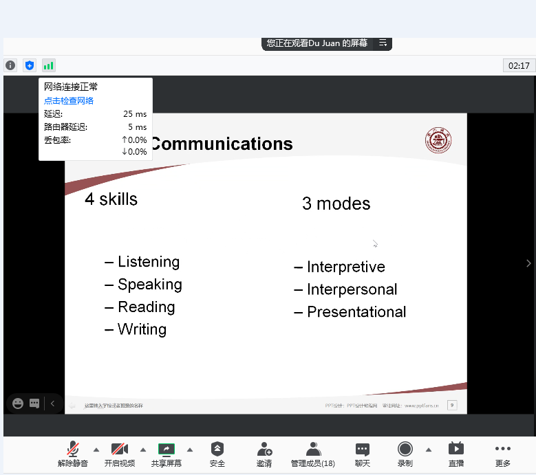 首先,杜老师介绍了大学英语课堂的教学理念,具体介绍逆向设计的教学体系、课程目标/评估、教学、教学目标、教学方法。强调员工会英语,在不同的场景下,能使用得体的英语进行交流,完成交流任务。