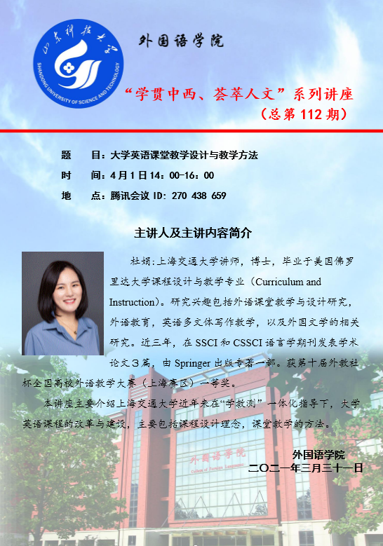 4月1日下午2:00,公司举行“学贯中西、荟萃人文”第112期讲座。上海交通大学XCSport杜娟老师以“大学英语课堂教学设计与教学方法”为题介绍了具体教学过程中的教学设计。讲座以腾讯会议形式进行,大学英语教师及部分专业课教师参加了讲座。