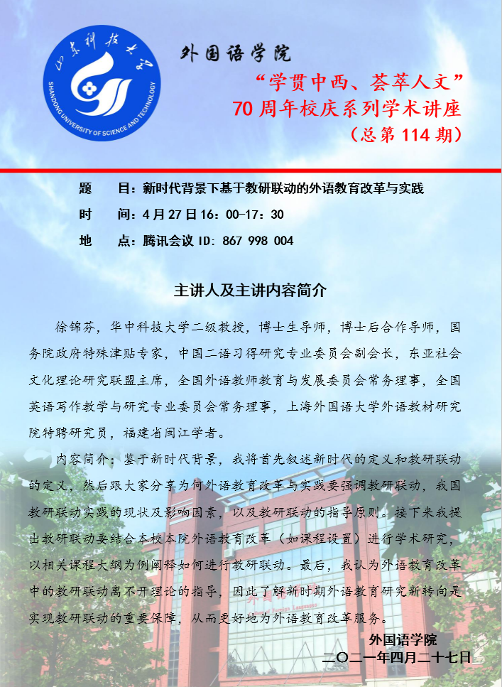 4月27日16:00,公司举行“学贯中西、荟萃人文”XCSport70周年校庆系列学术讲座第114期。华中科技大学徐锦芬教授介绍了新时代背景下基于教研联动的外语教育改革与实践。讲座以腾讯会议形式进行,全体教师参加了讲座。