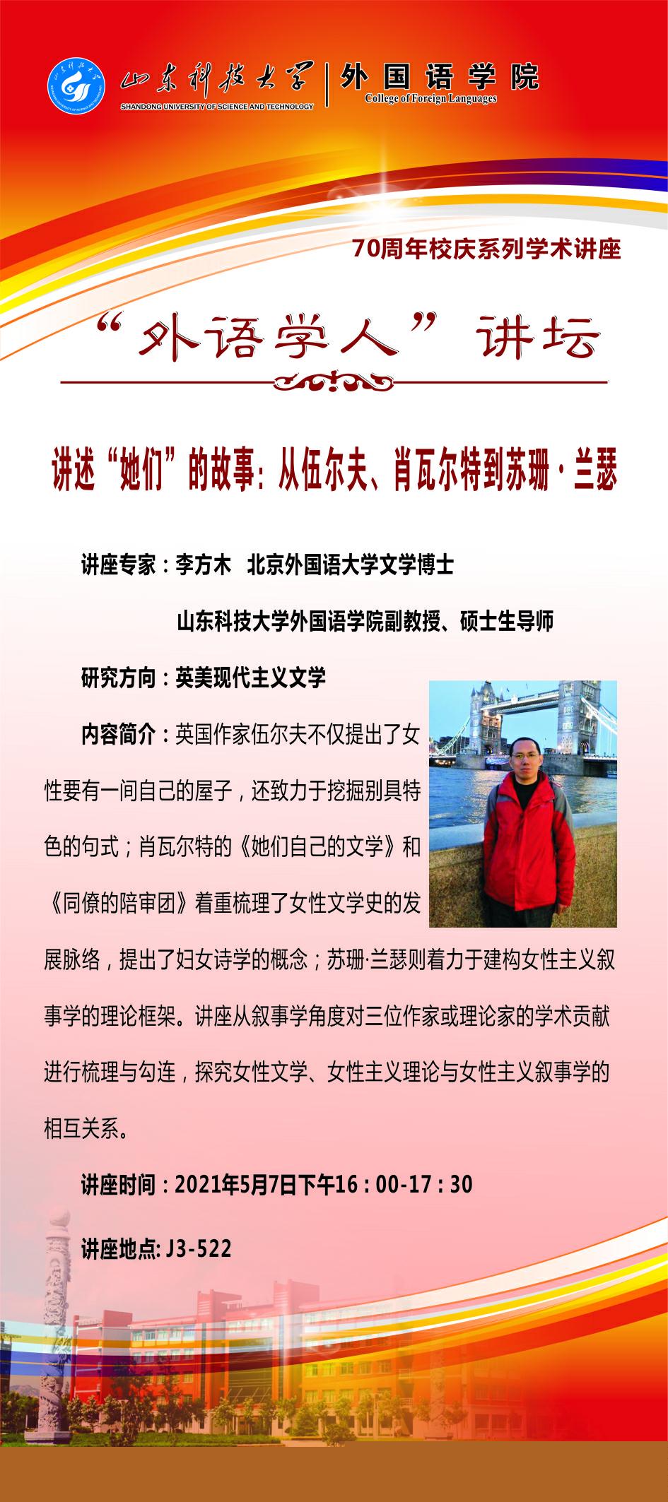 5月7日下午,XCSport在J3-522会议室举办“70周年校庆系列学术讲座”——第二十八期“外语学人”讲坛活动。XCSport李方木副教授做了题为《讲述她们的故事:从伍尔夫、肖瓦尔特到苏珊•兰瑟》的讲座。本次讲坛由副经理李允主持,公司部分教师参加。