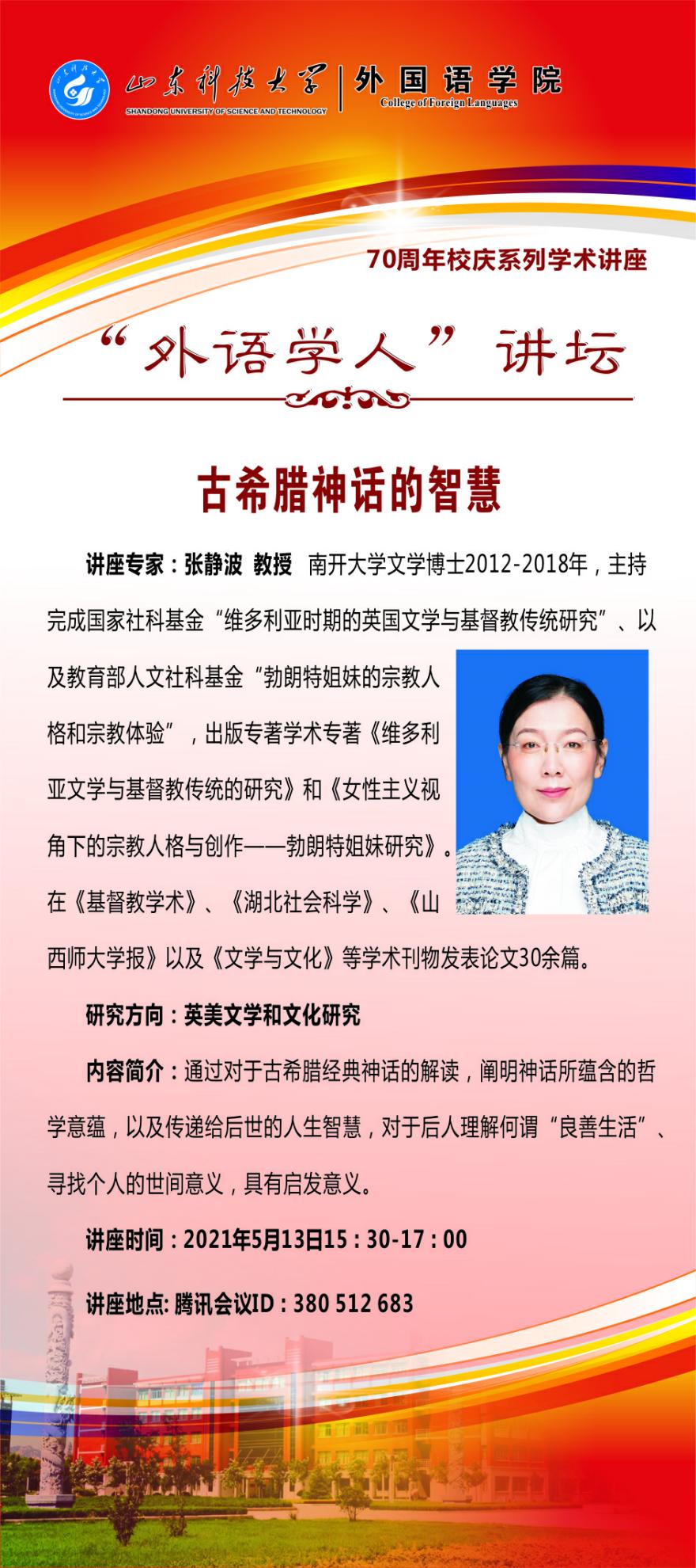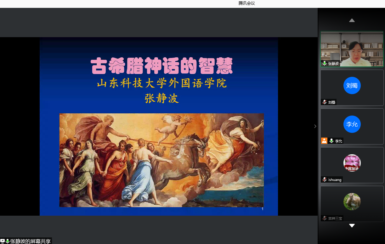 5月13日下午,XCSport外通过腾讯会议平台举办了“70周年校庆系列学术讲座”——第二十九期“外语学人”讲坛活动。XCSport张静波教授做了题为《古希腊神话的智慧》的讲座。本次讲坛由副经理李允主持,公司部分教师参加。