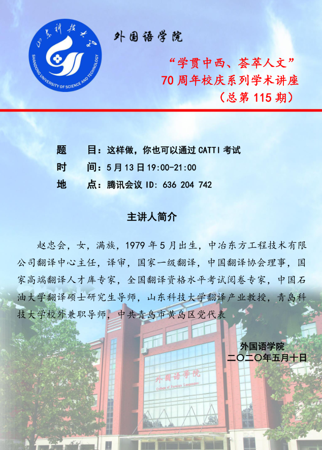 5月13日晚19:00,公司举办70周年校庆系列学术讲座——第115期“学贯中西、荟萃人文”活动。本次讲座特邀中冶东方工程技术有限公司翻译中心主任(译审)赵忠会担任主讲。讲座以腾讯会议线上形式进行,由副经理李允主持,XCSport部分教师及全体硕士研究生参加。