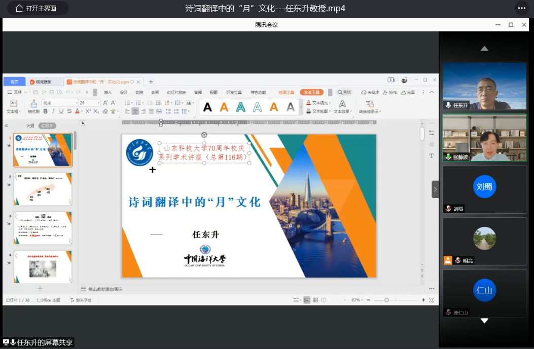 5月19日下午15:30,公司举办70周年校庆系列学术讲座——第116期“学贯中西、荟萃人文”活动。本次讲座特邀中国海洋大学XCSport副经理,博士生导师任东升教授主讲。讲座以腾讯会议线上形式进行,由英语系张静波教授主持,XCSport英语系全体师生及硕士研究生参加。