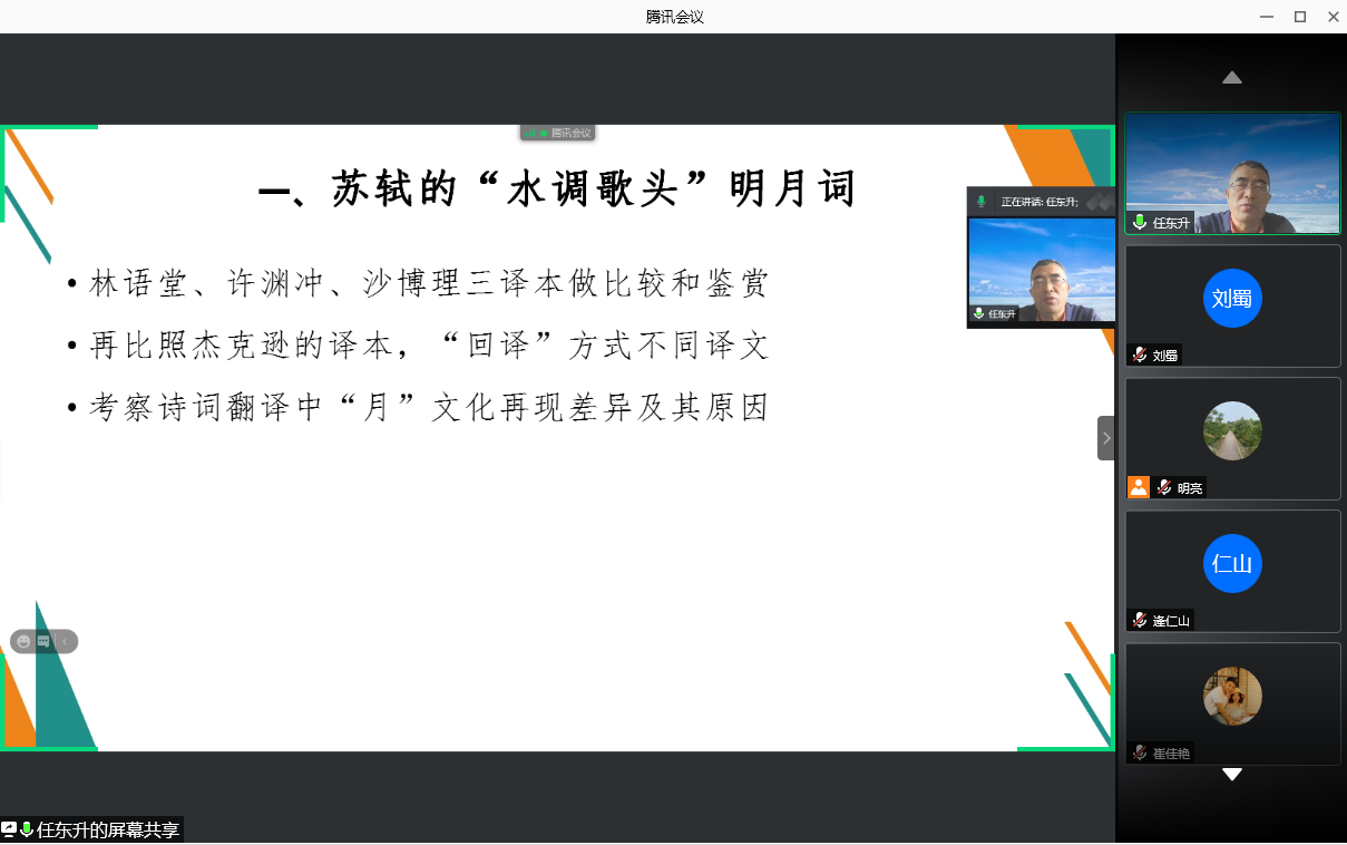 在“诗词翻译中的‘月’文化”这一主题的引领下,任东升教授指出不同民族文化传统对月亮的艺术想象和文学表现有所不同。讲座首先从“月”文化的民族特色切入中国诗词里色彩纷呈的“月”文化,以苏轼的“水调歌头”明月词林语堂、许渊冲、沙博理三译本做比较和鉴赏,再比照杰克逊的译本,探讨诗词翻译中“月”文化再现差异及其原因。任教授还强调指出,中国诗词翻译应以准确的原文解读为前提,避免过于个性化的译者“显身”而导致的中国诗词“月”意象变形、“月”文化人文性的丧失。