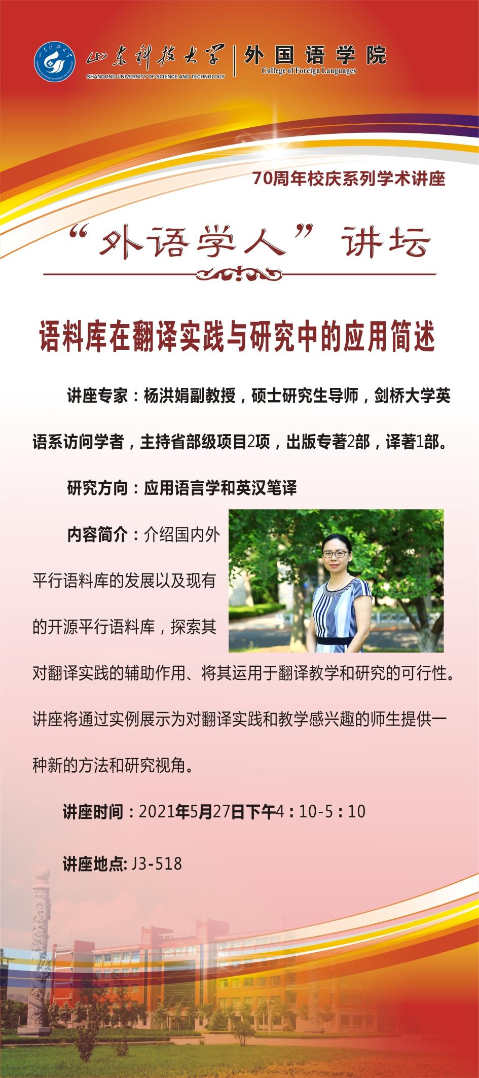 5月27日下午,XCSport在J3-518举办了“70周年校庆系列学术讲座”——第三十一期“外语学人”讲坛活动。XCSport杨洪娟副教授做了题为《语料库在翻译实践与研究中的应用简述》的讲座。本次讲坛由副经理李允主持,公司部分教师参加。