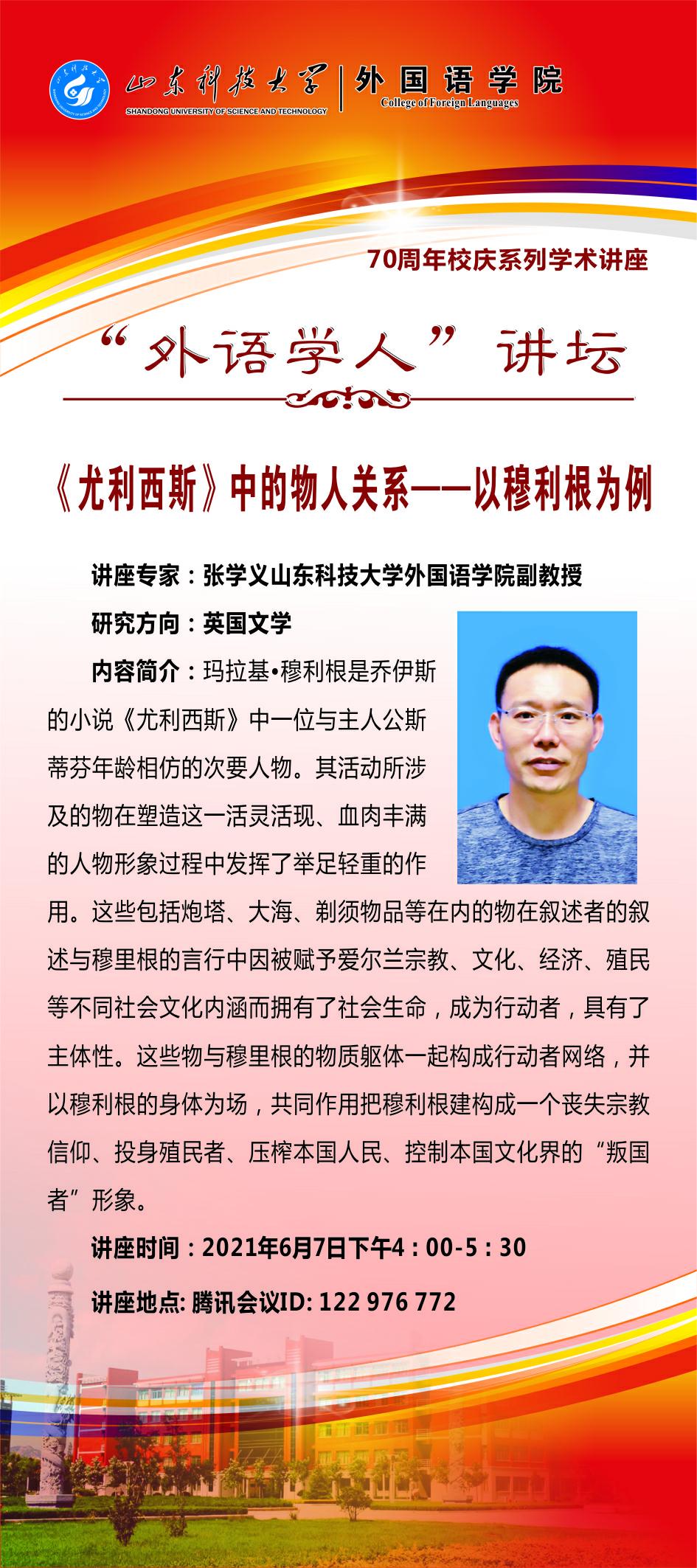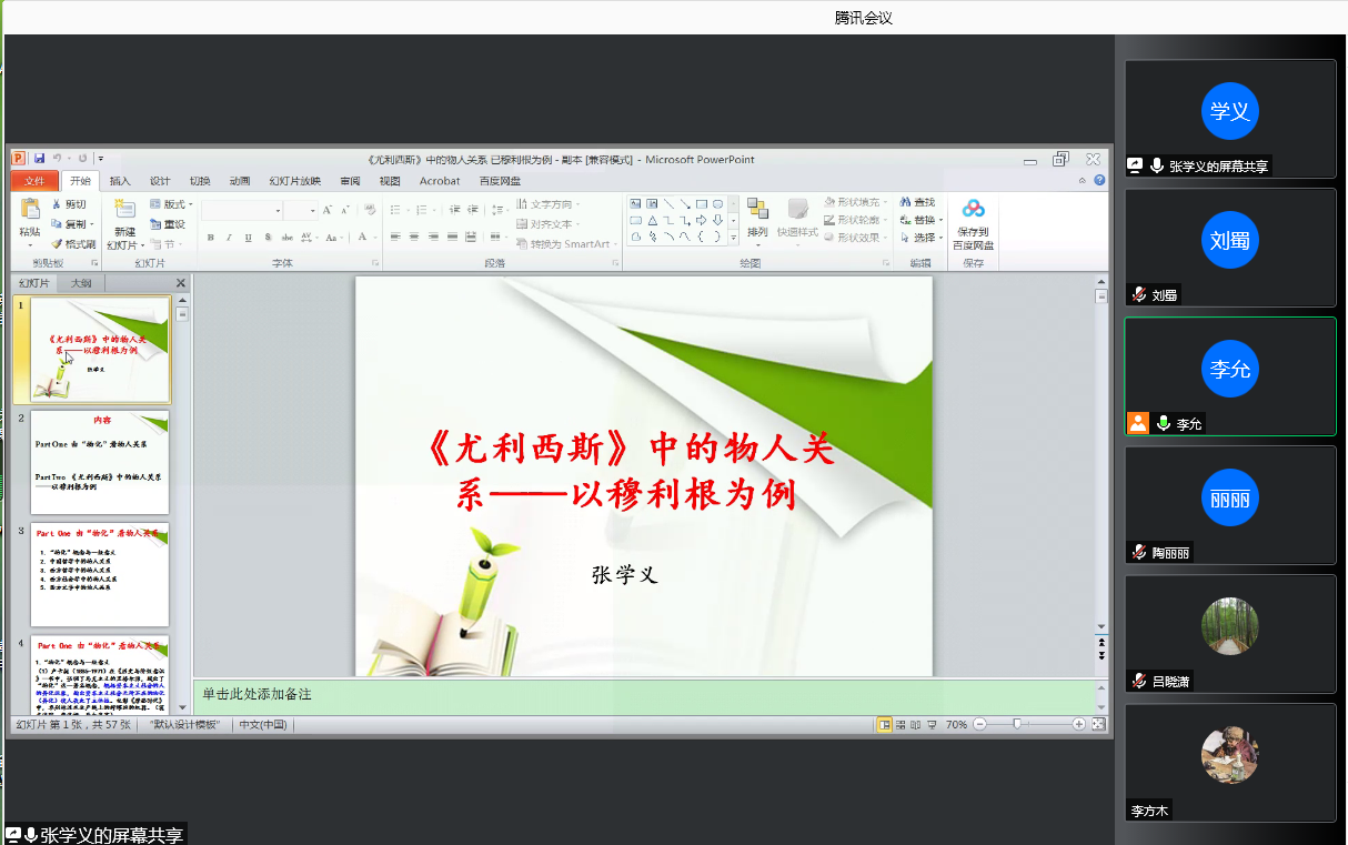 6月7日下午,XCSport外通过腾讯会议平台举办了“70周年校庆系列学术讲座”——第三十三期“外语学人”讲坛活动。XCSport张学义副教授做了题为《《尤利西斯》中的物人关系——以穆利根为例》的讲座。本次讲坛由副经理李允主持,公司部分师生参加。